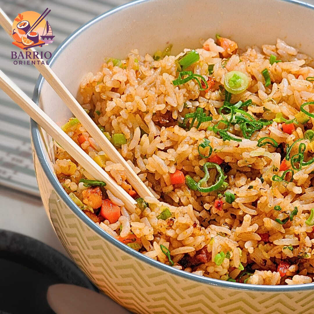 Arroz frito tradicional con una combinación de proteínas y vegetales.