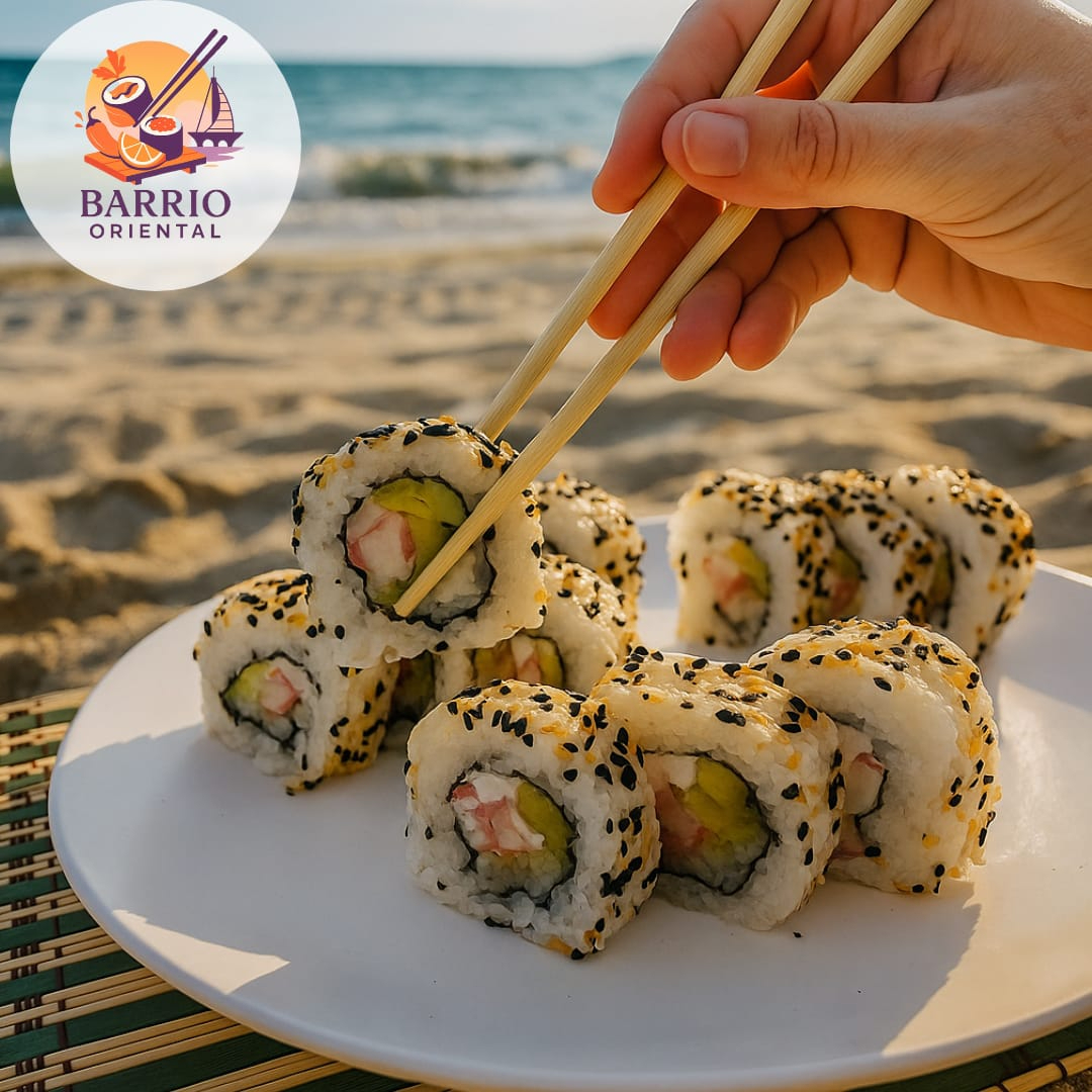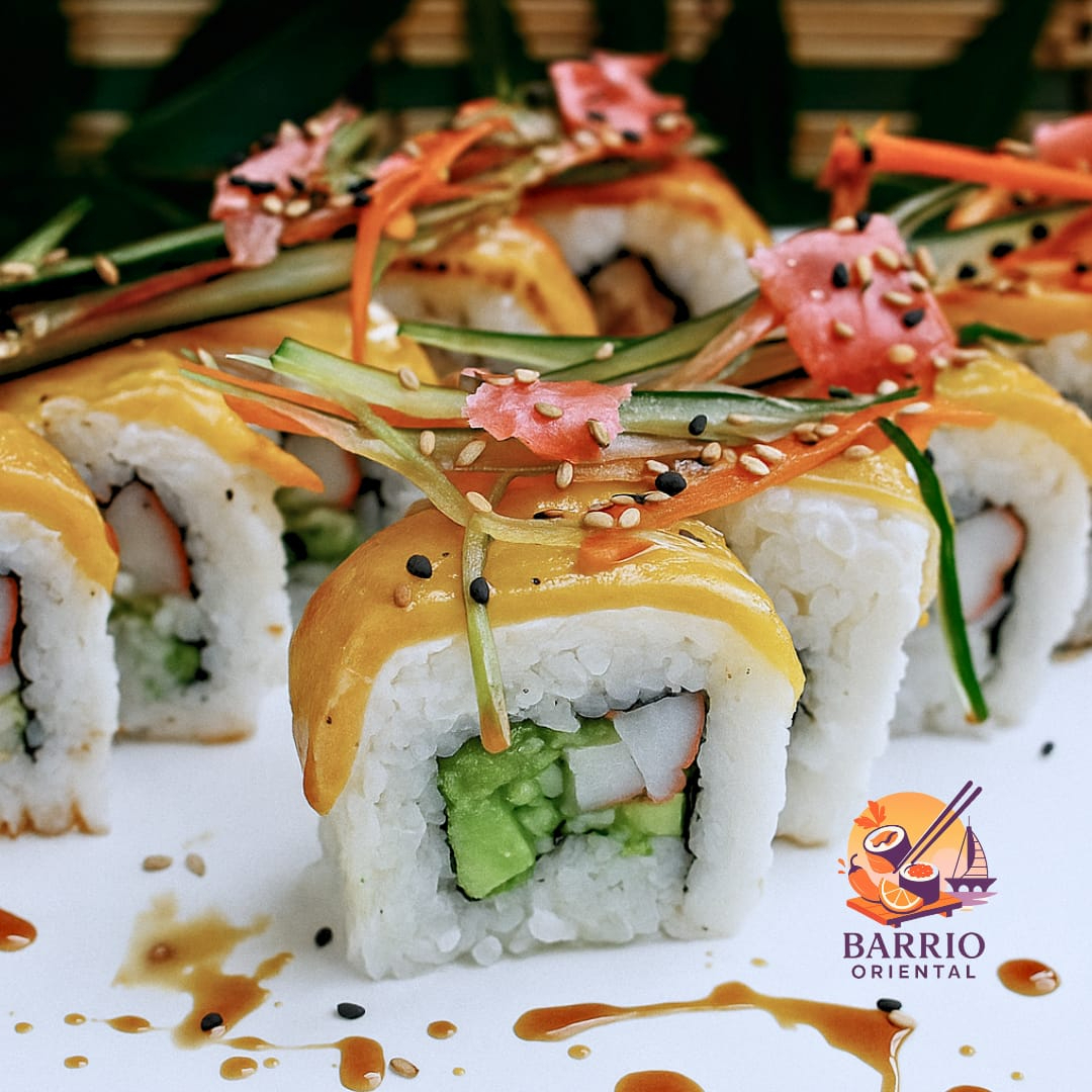 Forrado con plátano macho frito con topping de ensalada kani, salsa de anguila y ajonjolí.