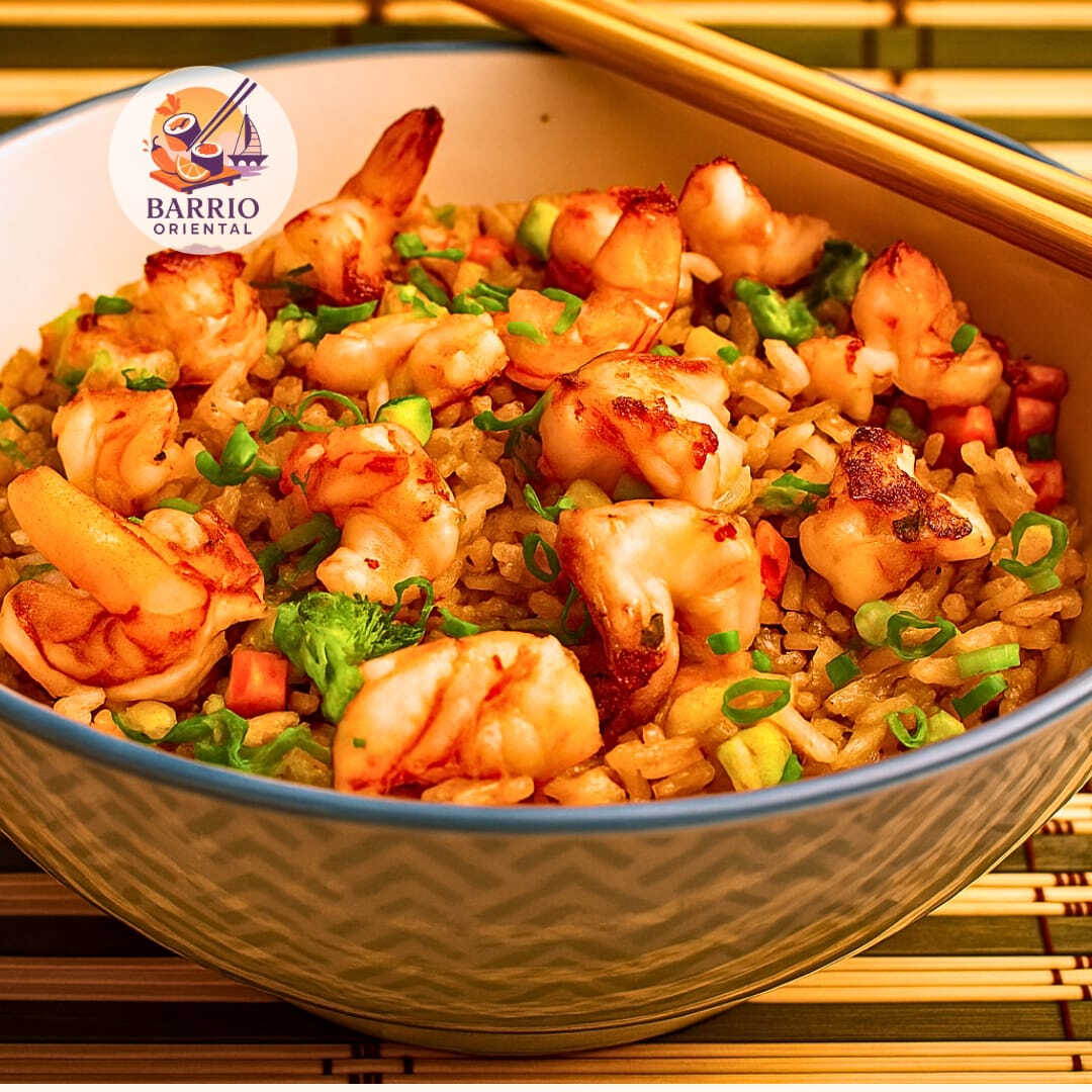 Arroz frito tradicional con camarones frescos y vegetales.