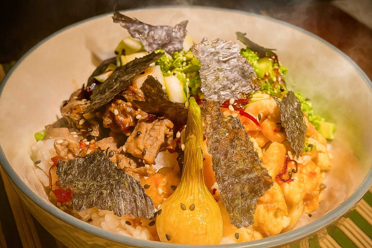 Bowl de arroz con res, salsa chili ajillo, pepino, aguacate, alga, brócoli, ajonjolí y cebollín.