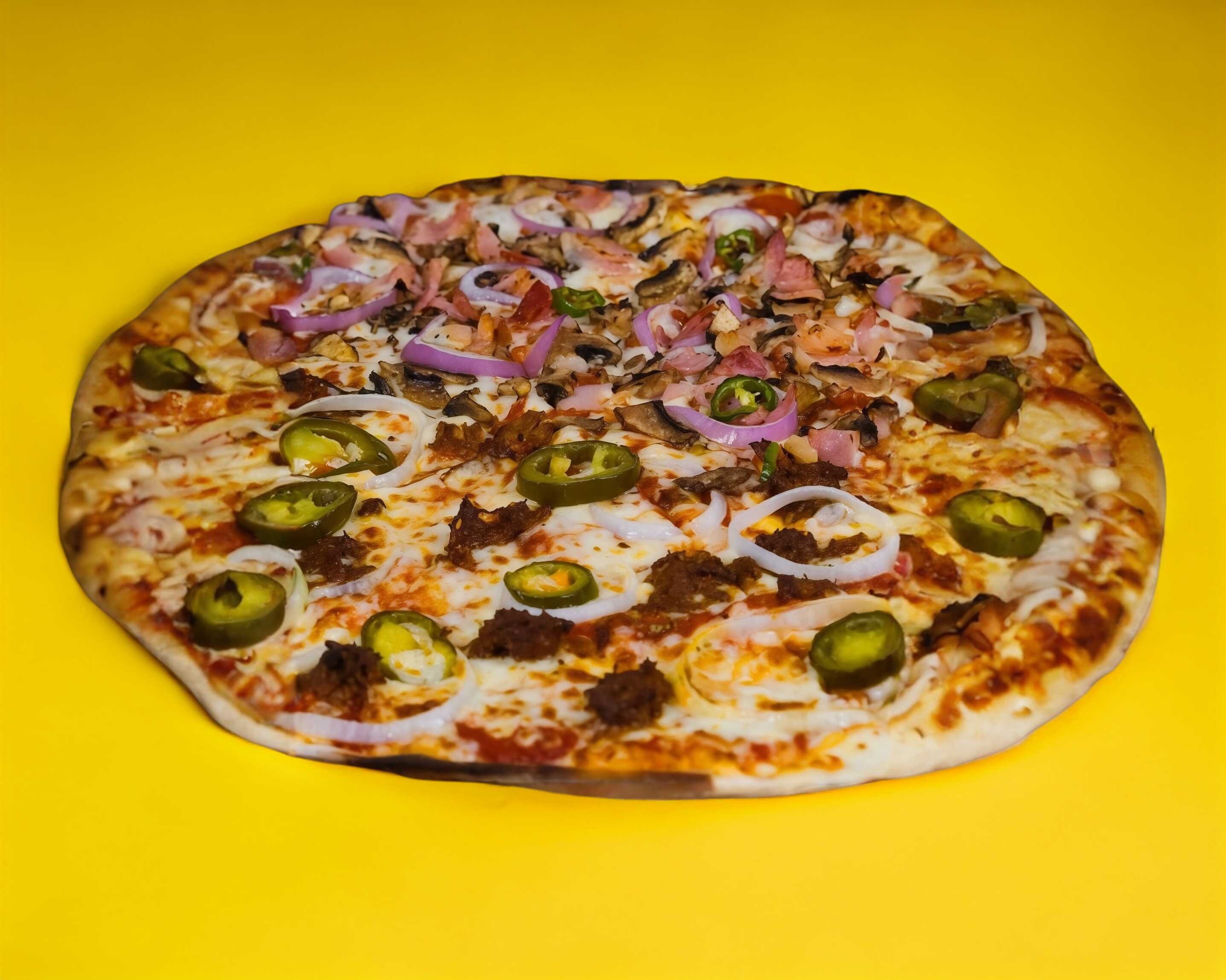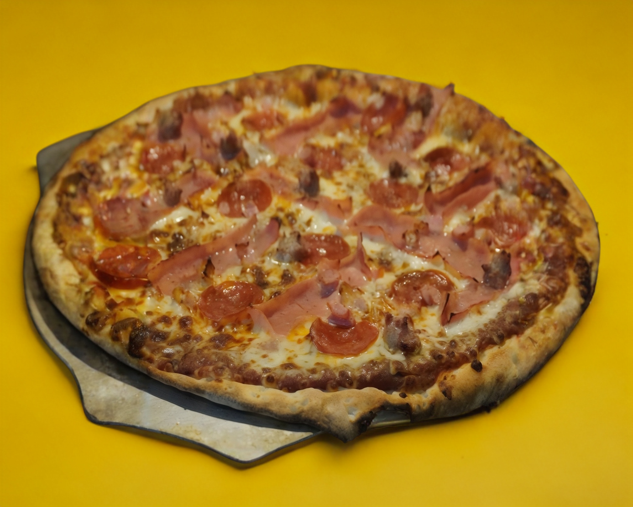 Jamón, pepperoni, tocino, salchicha italiana, acompañada de una base de masa de pizza.