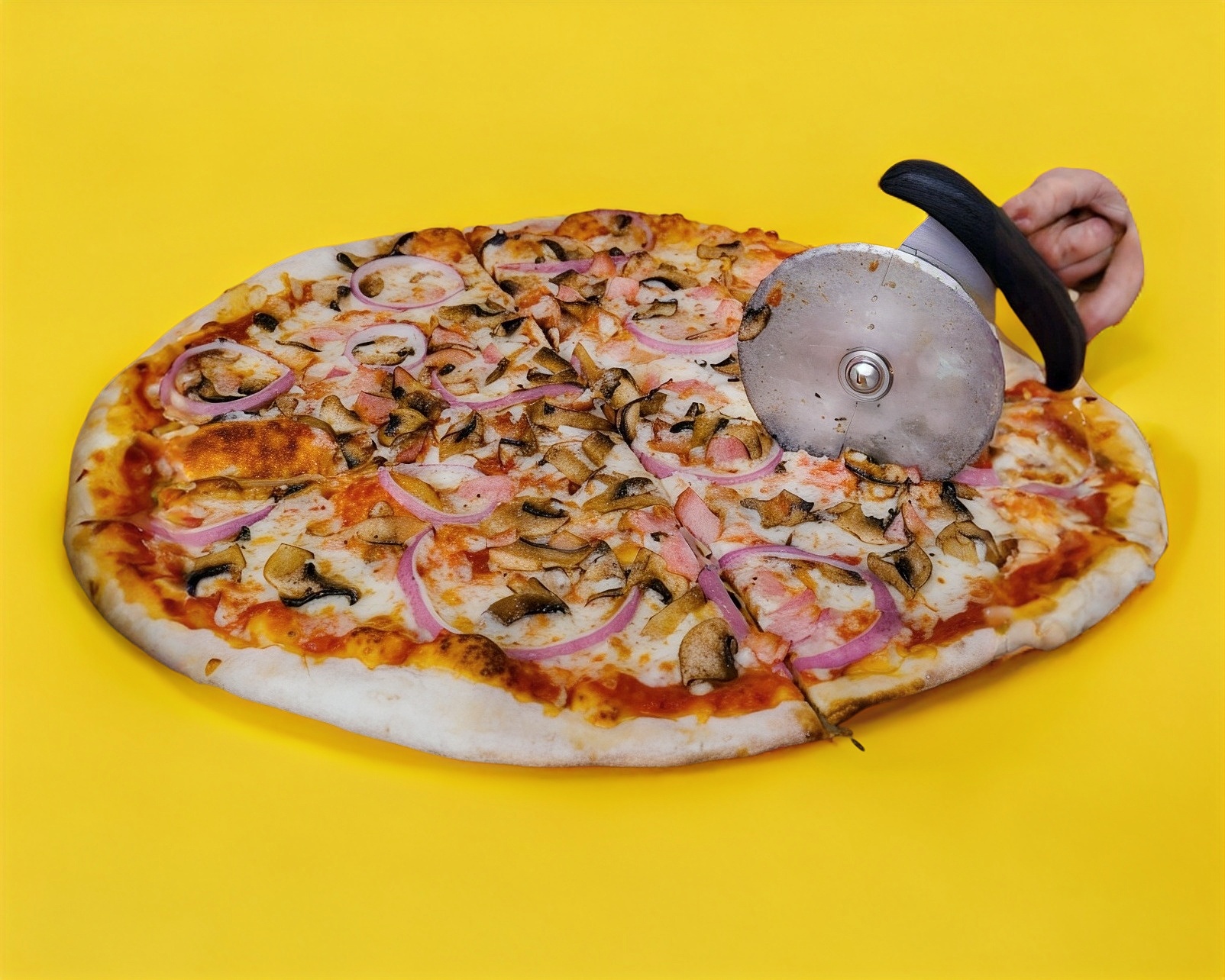 Tocino, champiñones, cebolla morada, acompañada de una base de masa de pizza.