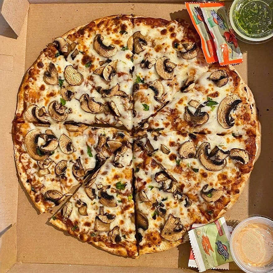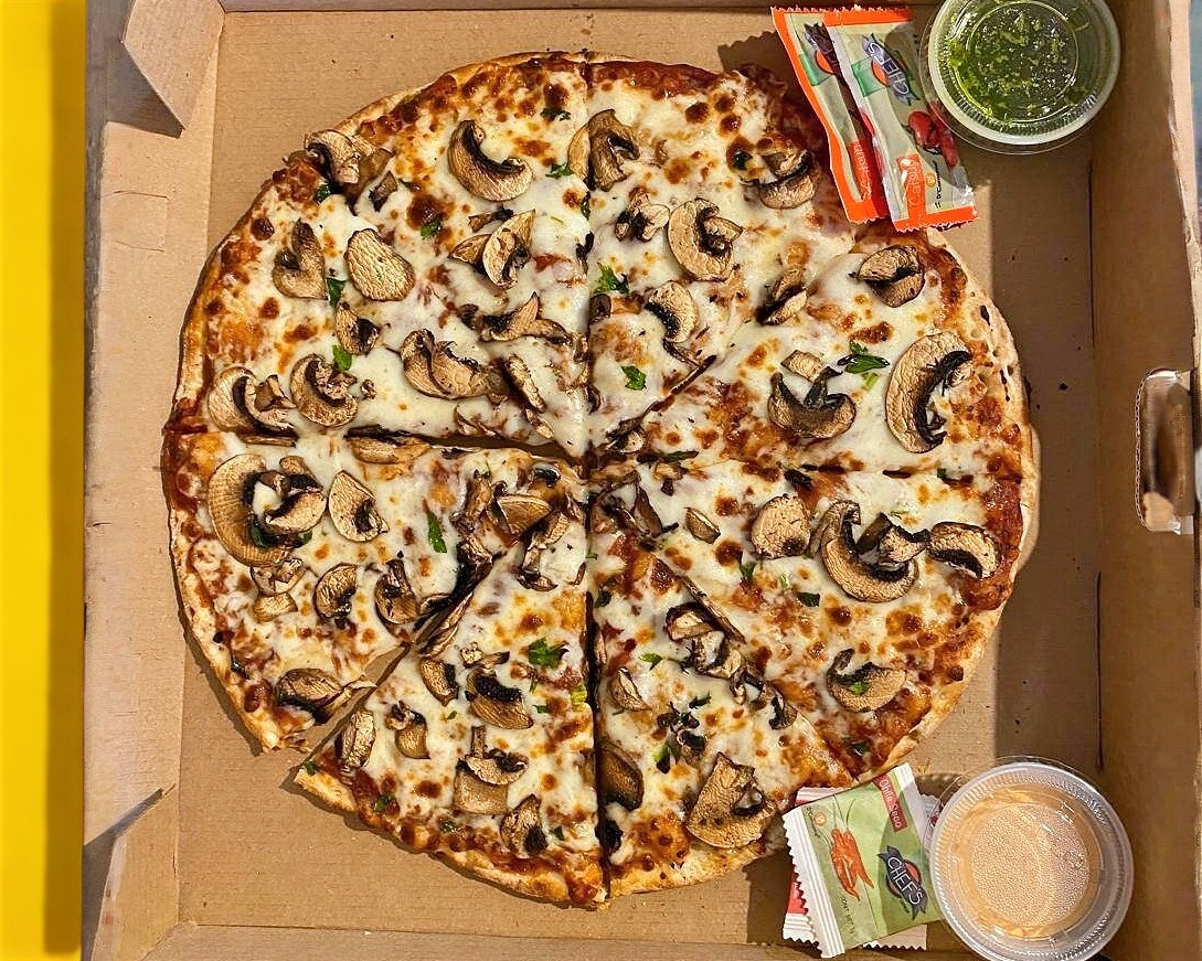 Salsa de tomate, queso mozzarella, champiñones frescos, acompañada de una base de masa de pizza.