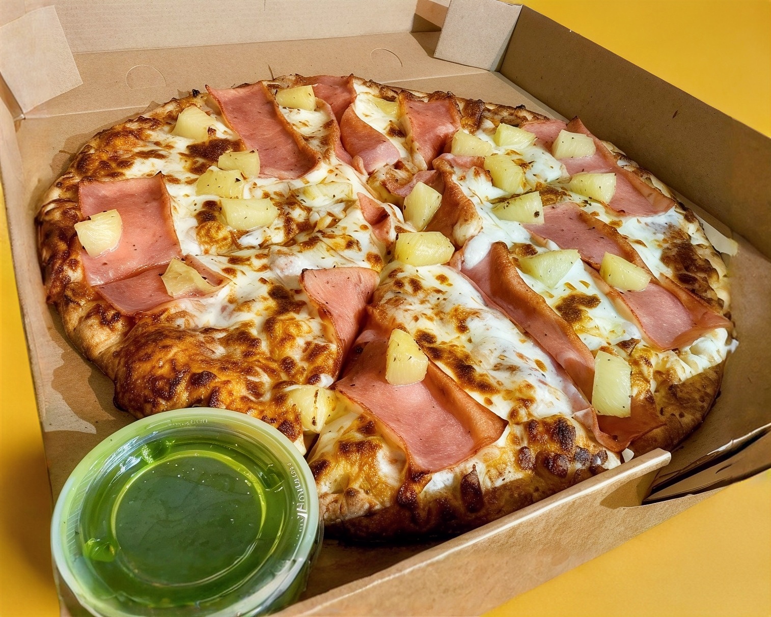 Salsa de tomate, queso mozzarella, jamón, piña, acompañada de una base de masa de pizza.