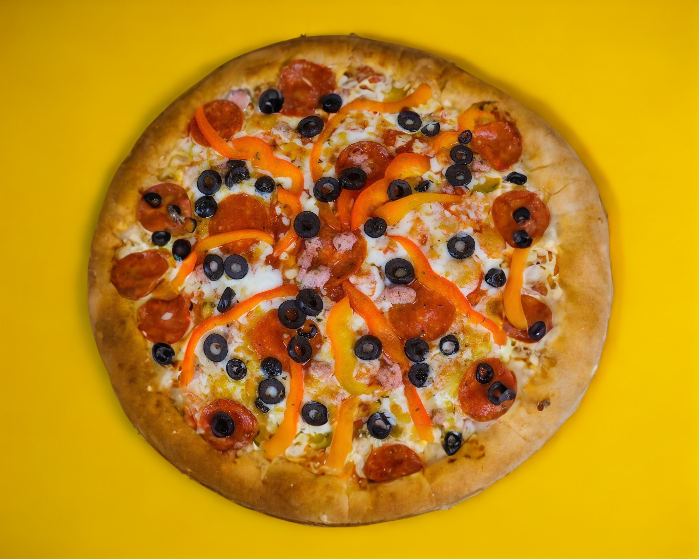 Aceitunas, pimiento, salchicha italiana, pepperoni, acompañada de una base de masa de pizza.