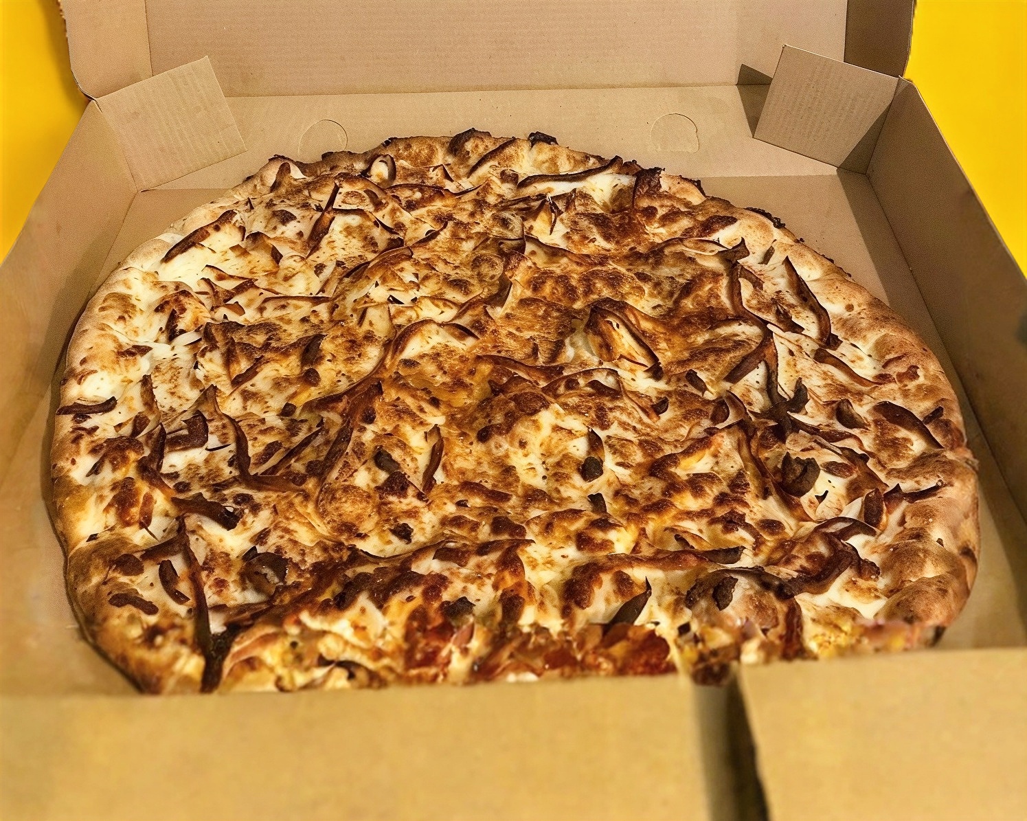 Chilorio, jalapeño, cebolla blanca, acompañada de una base de masa de pizza.