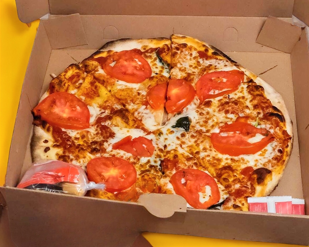 Queso mozzarella, albahaca fresca, jitomate fresco, acompañada de una base de masa de pizza.
