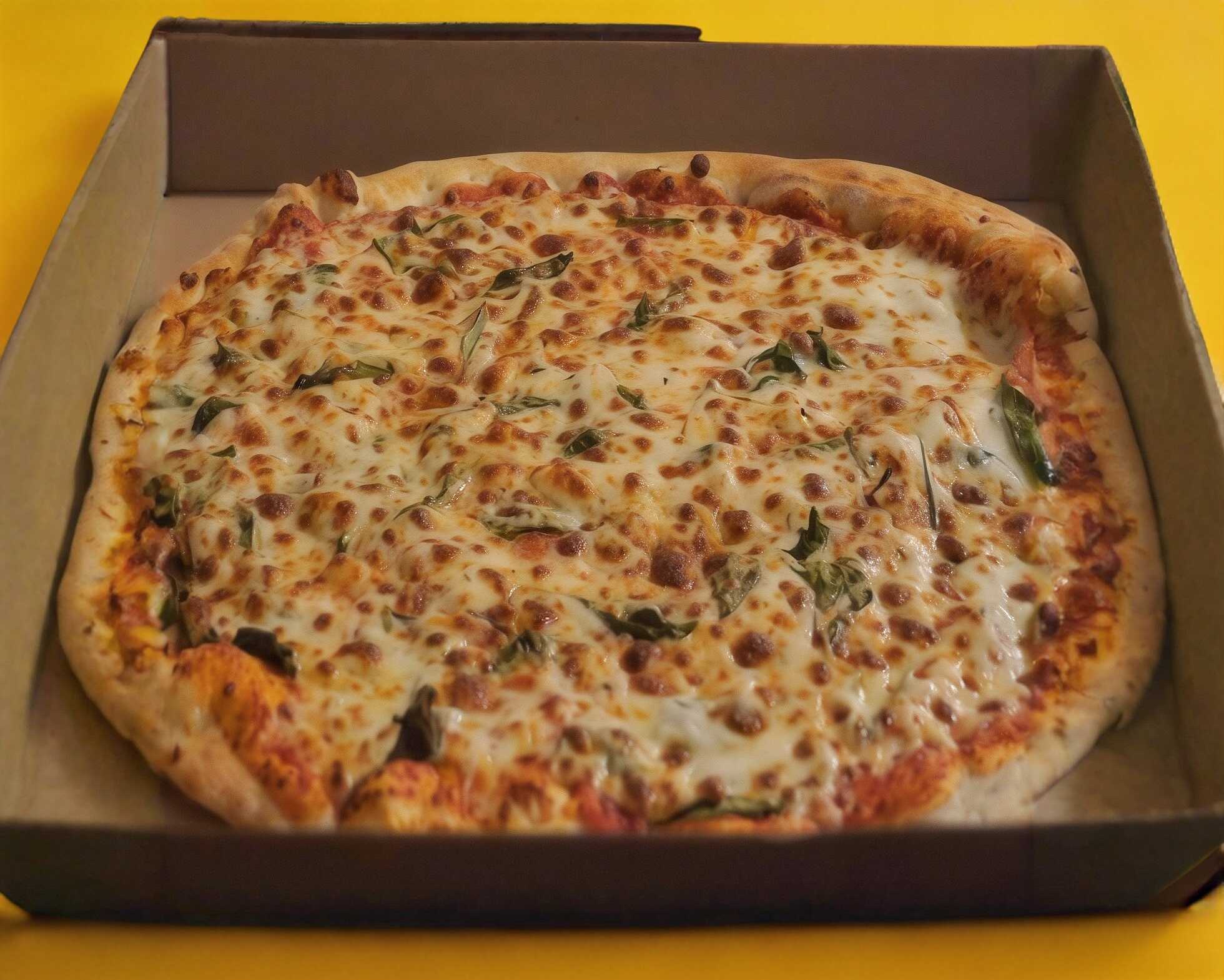 Mozzarella, gorgonzola, parmesano, provolone, acompañada de una base de masa de pizza.