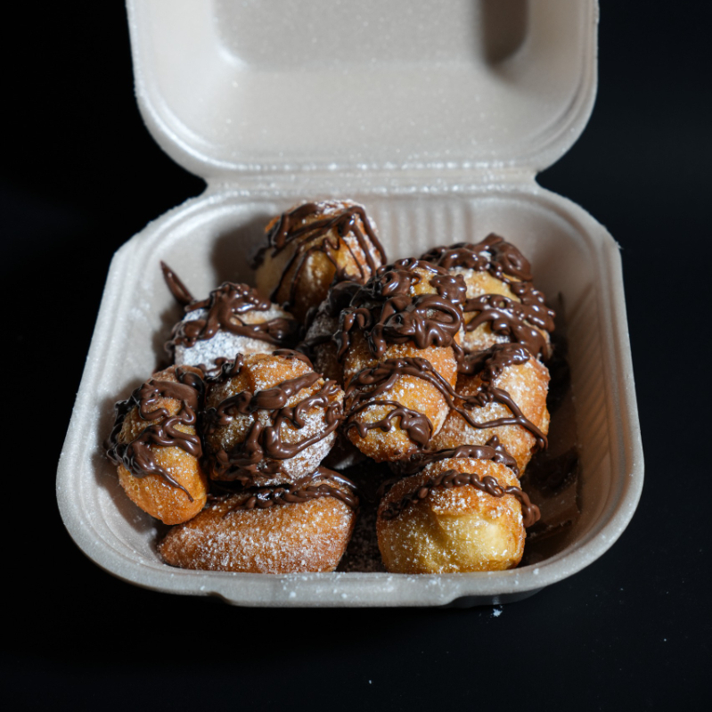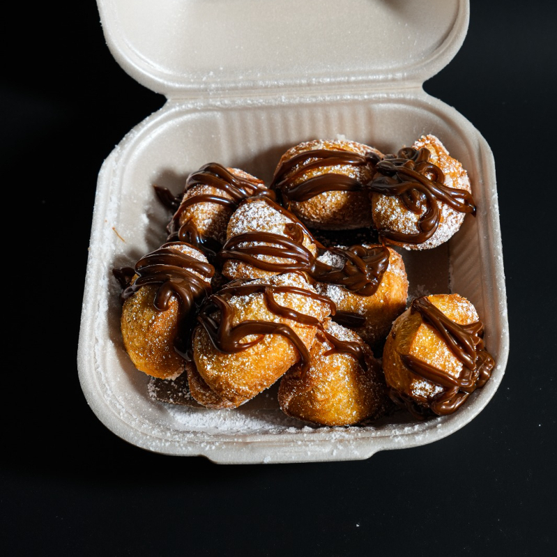 Camarón, cebolla, perejil, ajo, acompañada de una base de masa de pizza.