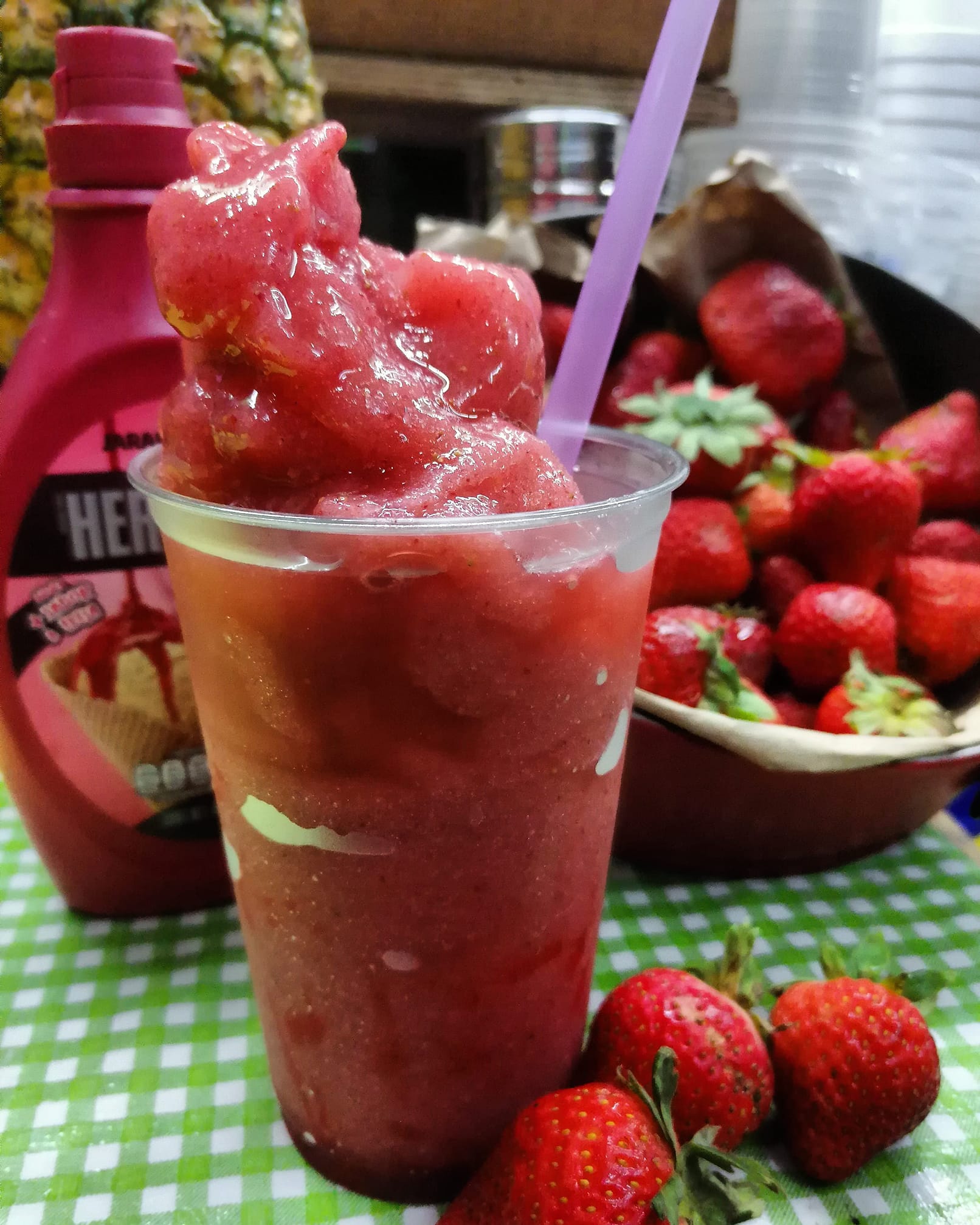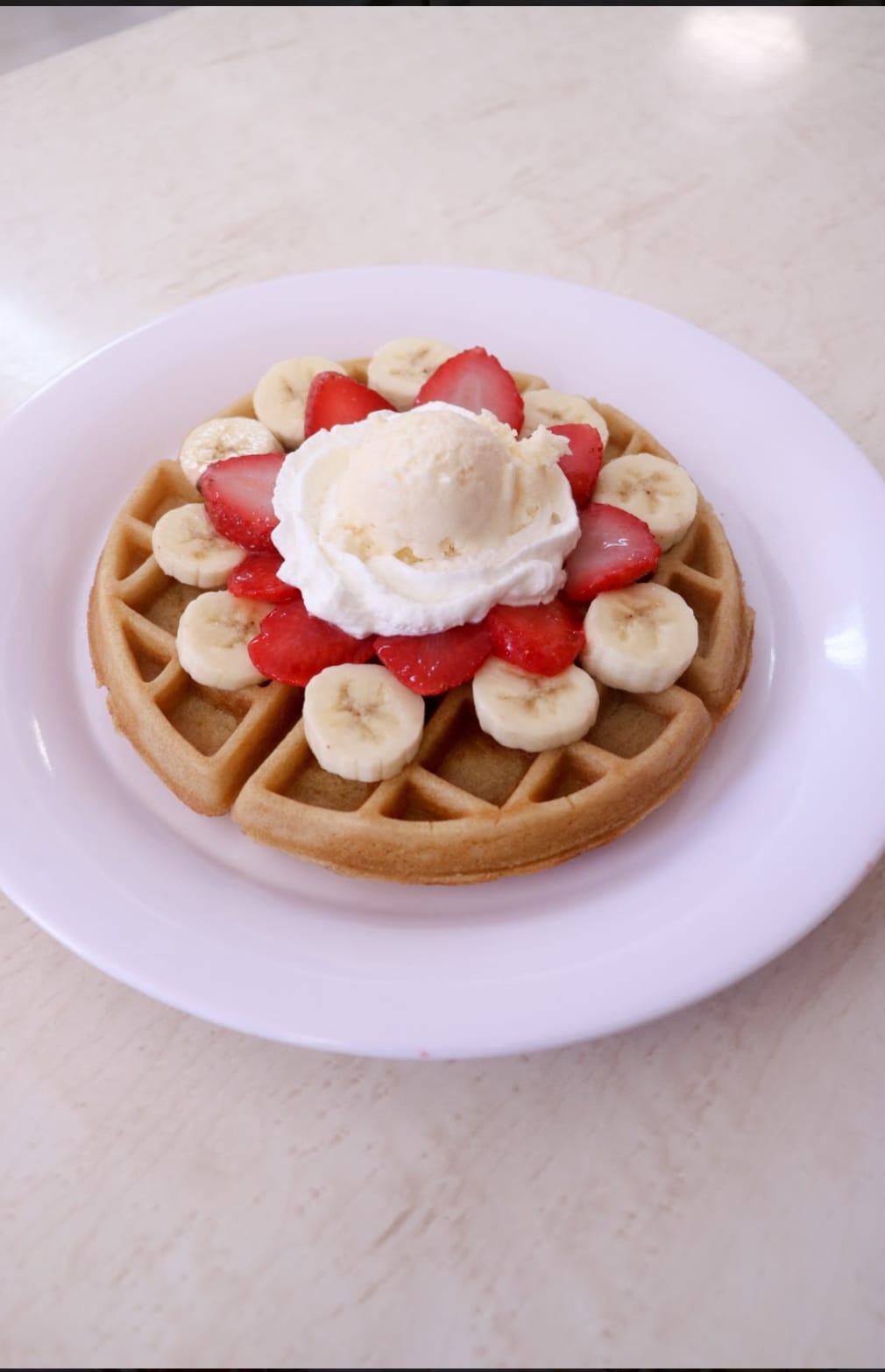 Servido con fresa y/o Plátano, nieve y crema chantilly encima.