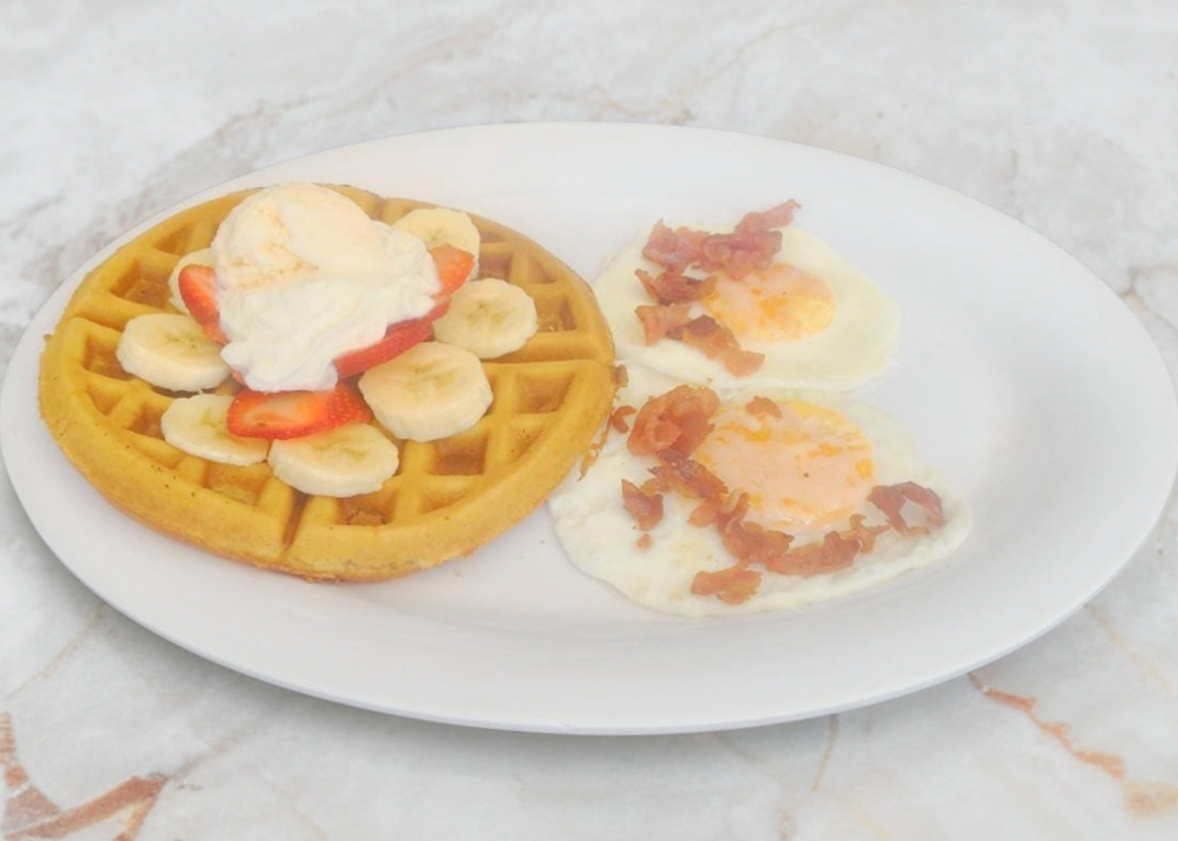 1 waffle con 2 huevos y tocino.