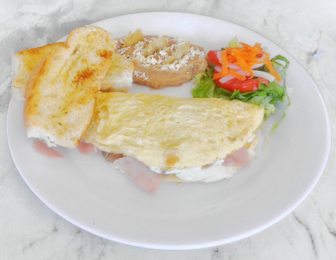 Incluye plato de frutas y una bebida. Con frijoles, ensalada y pan con ajo.