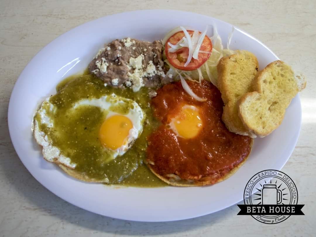 Incluye plato de frutas y una bebida. Porción de chilaquiles verdes o rojos, un huevo estrellado con frijoles, arrachera, ensalada, pan con ajo y una quesadilla grande.