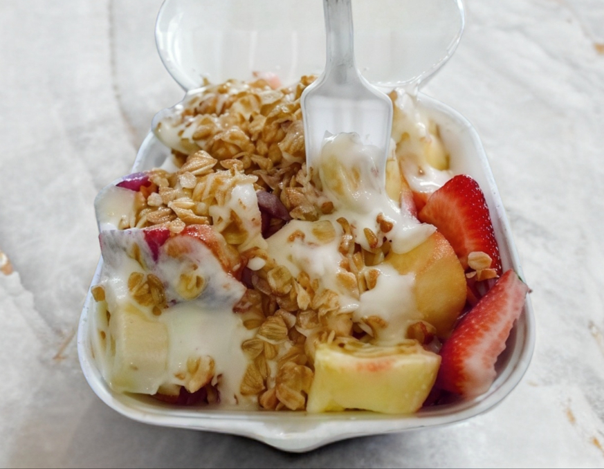 Yogurt, manzana, papaya, melón, plátano, granola y fresa.