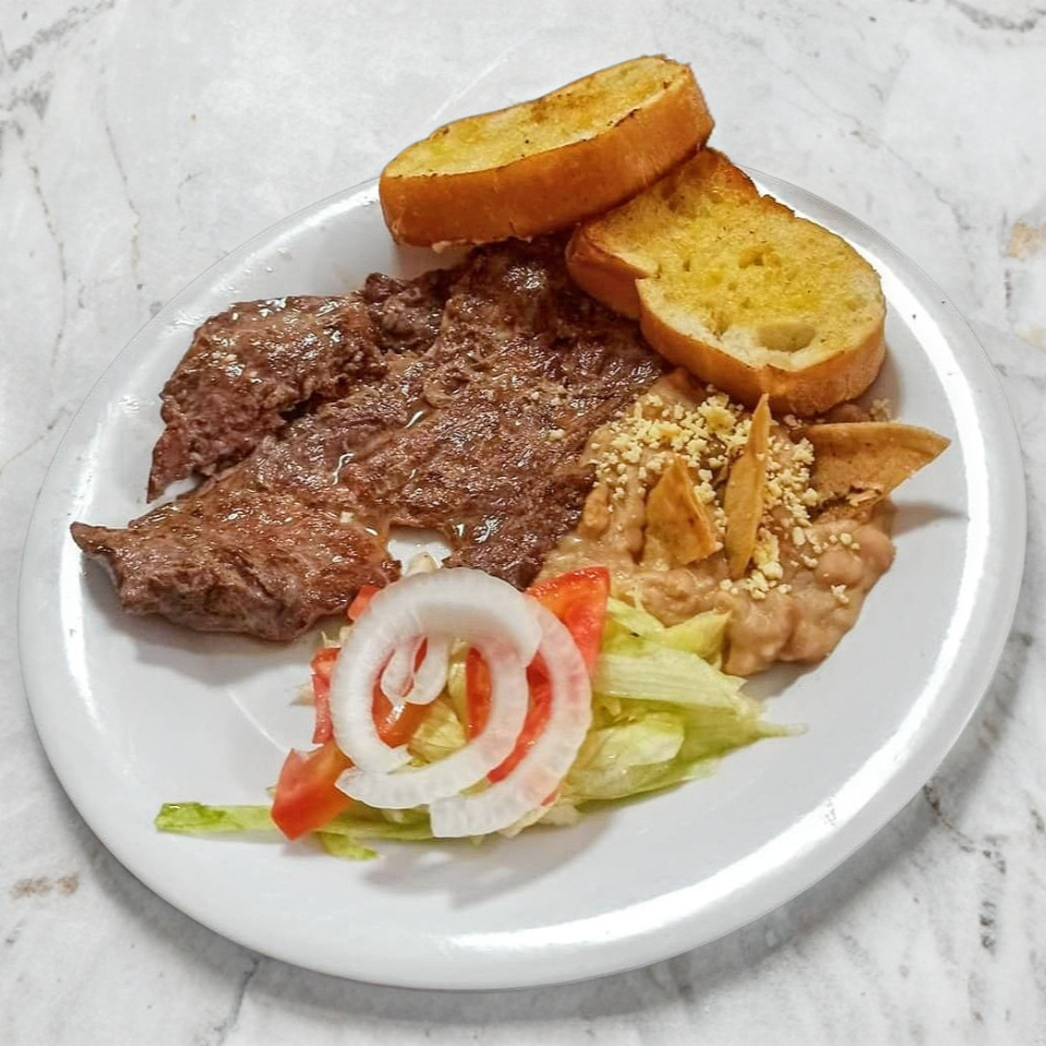Incluye plato de frutas y una bebida. Arrachera marinada, ensalada y frijoles y pan de ajo.