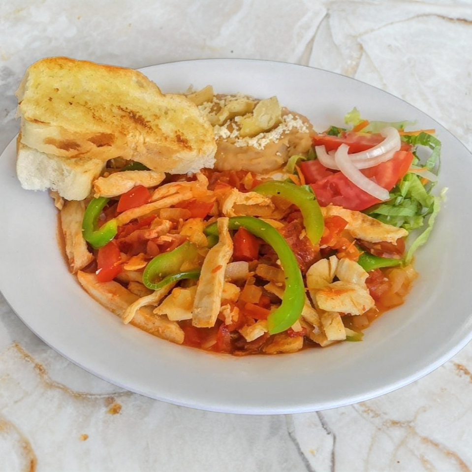 Incluye plato de frutas y una bebida. Con morrón, jitomate, cebolla, frijoles, ensalada y pan con ajo.