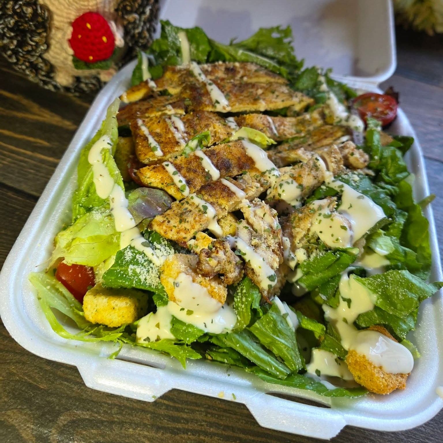 Con una capa de leckugas aderezo cesar , crotoness, queso parmesano y pollo a la plancha