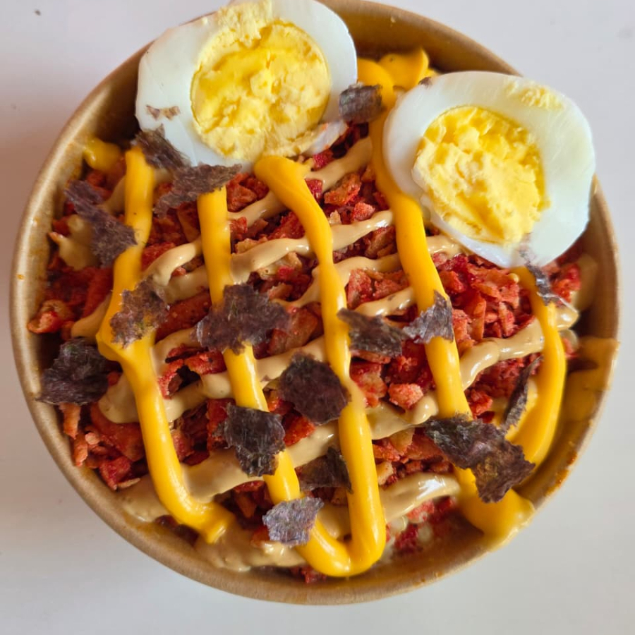Elote preparado, queso amarillo, salsa de la casa (muy picosa), huevo cocido, y topping doble Takis.