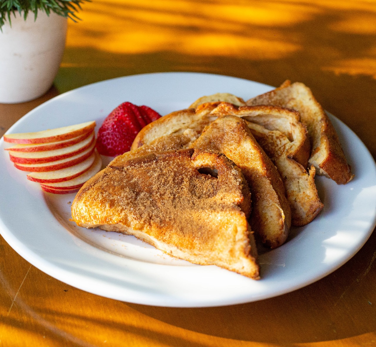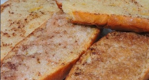 Delicioso pan previamente mojado en una mezcla de huevo leche y azúcar. Espolvoreado con canelaespolvoreado con canela