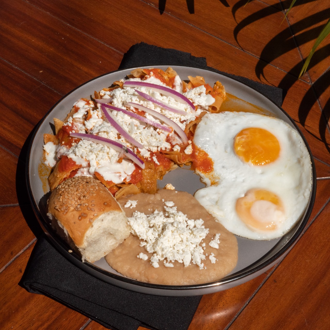 Chilaquiles con queso, crema y cebolla. Acompañados de frijoles y un bollito