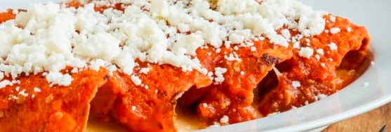 4 pz de pollo bañadas en salsa de jitomate. Acompañado de crema, queso cotija y cebolla