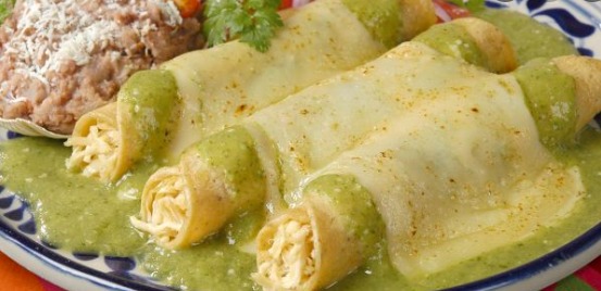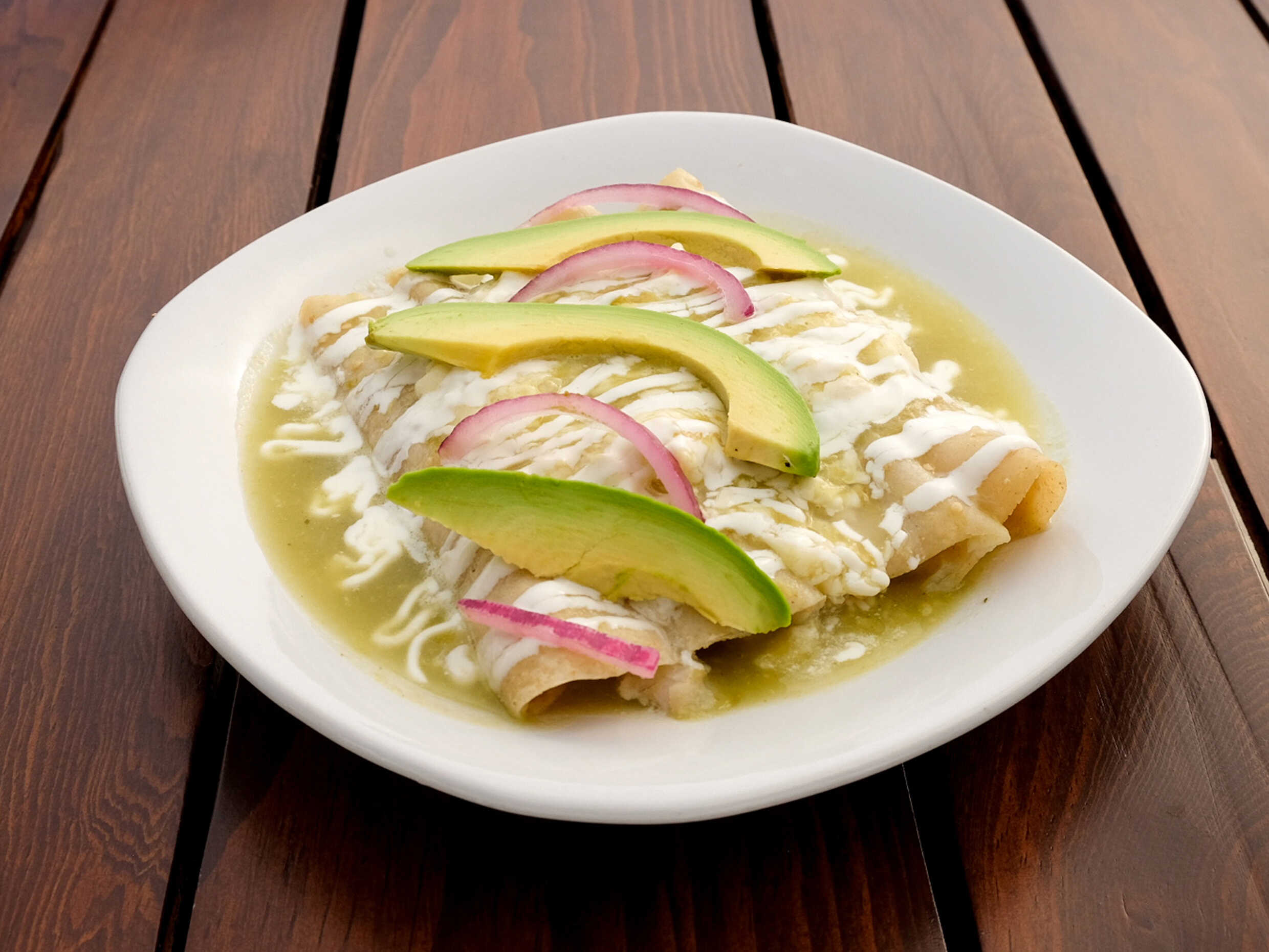 4 piezas en salsa de tomatillo verde. Acompañado de queso derretido, crema, cebolla aguacate