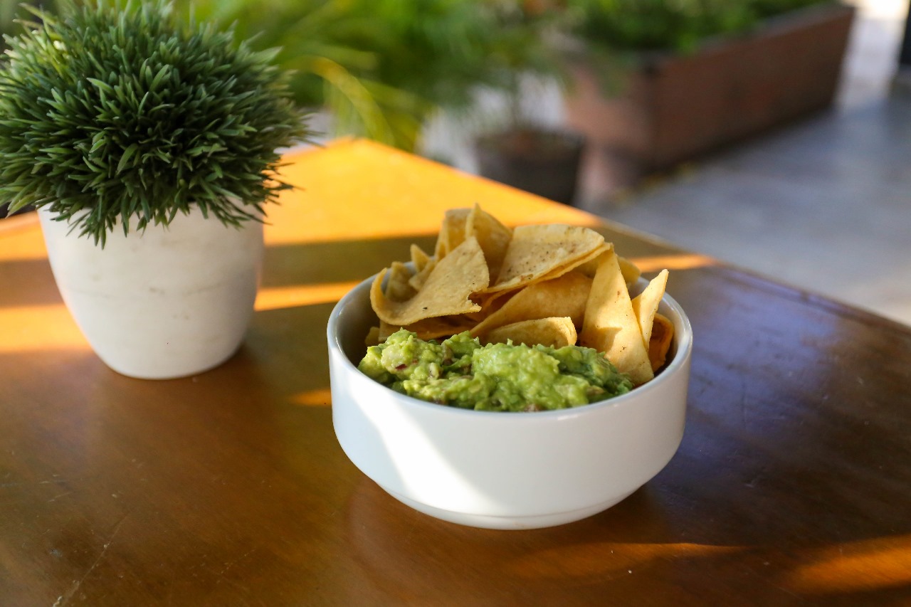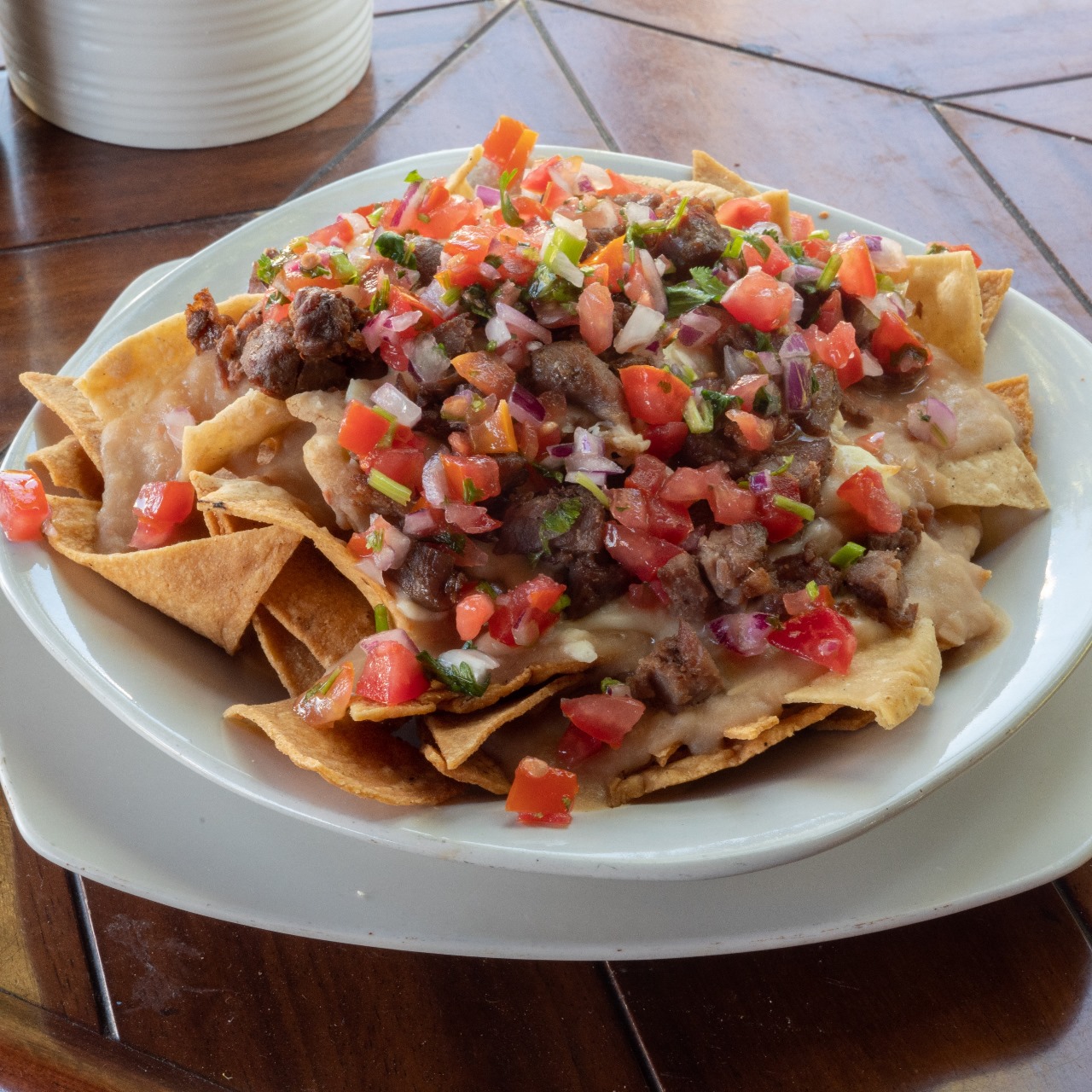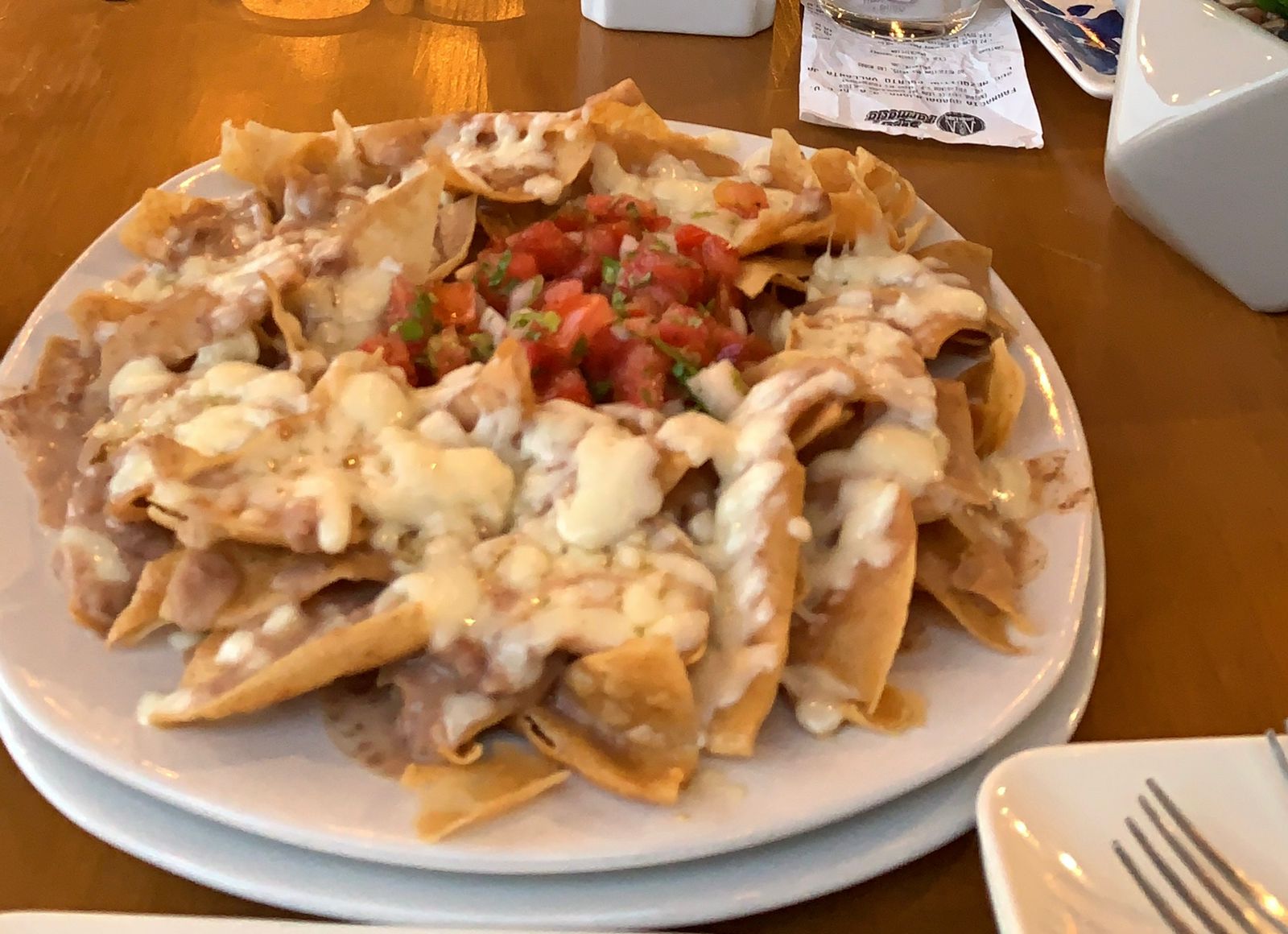 Totopos bañados en salsa de frijoles y queso gratinado. Acompañada de salsa pico de gallo