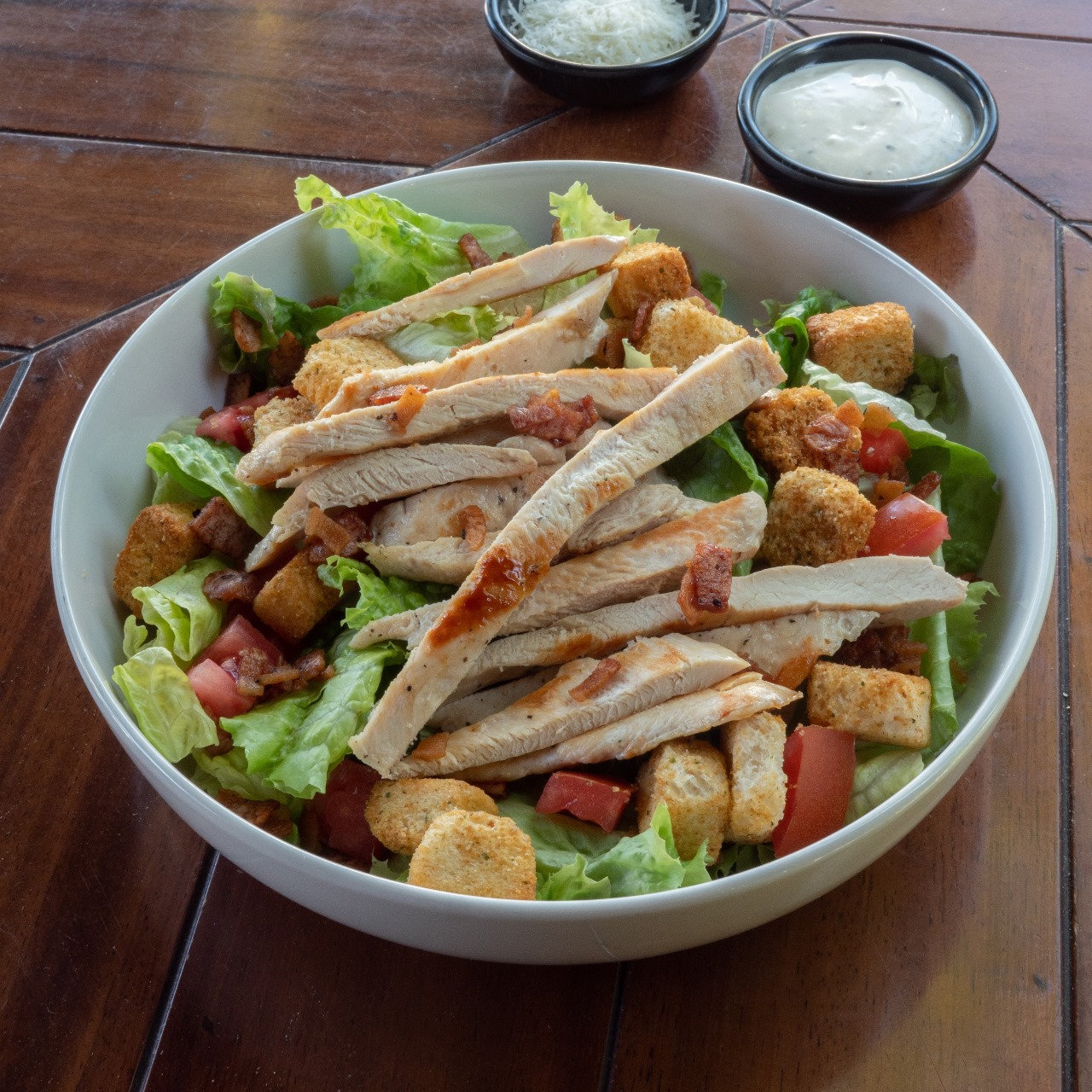 Lechuga orejonas, jitomate, tocino, pollo a la plancha, crotones y aderezo cesar