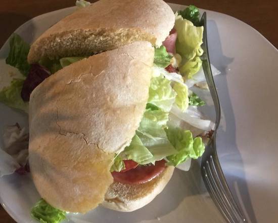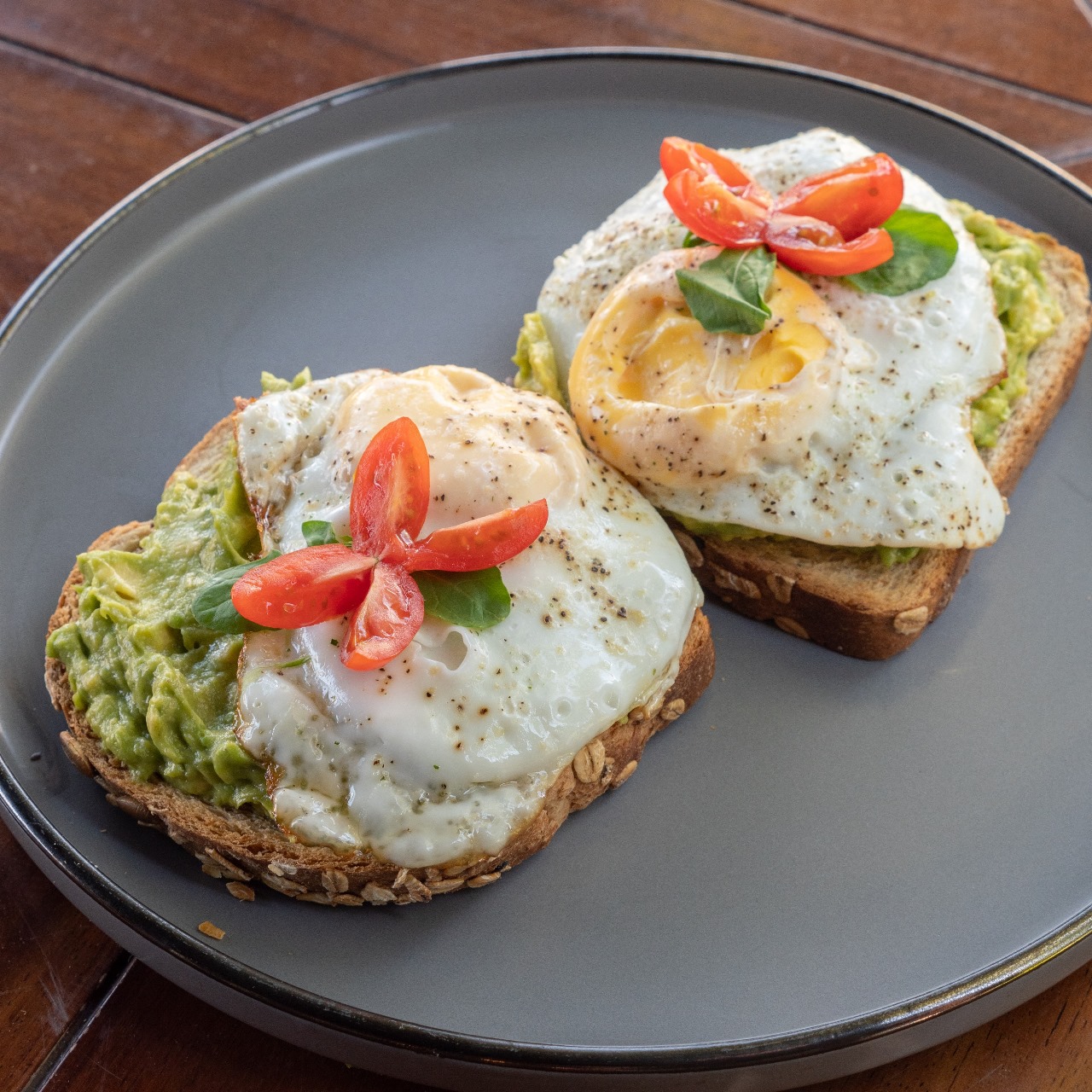 Pan de sandwich tostado con aguacate molido, lechuga y jitomate cherry.