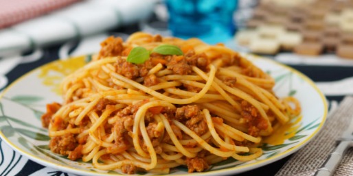 Espagueti con 300 g de carne a la boloñesa y rebanadas de pan tostado
