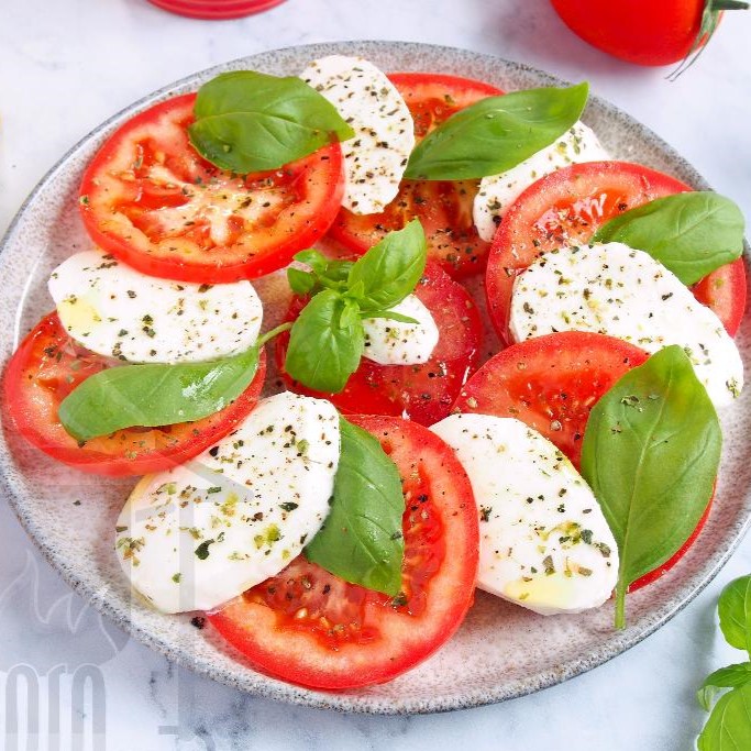 Tomate bola, queso mozzarella fresca, albahaca fresca, aceite de oliva y vinagre balsámico.
