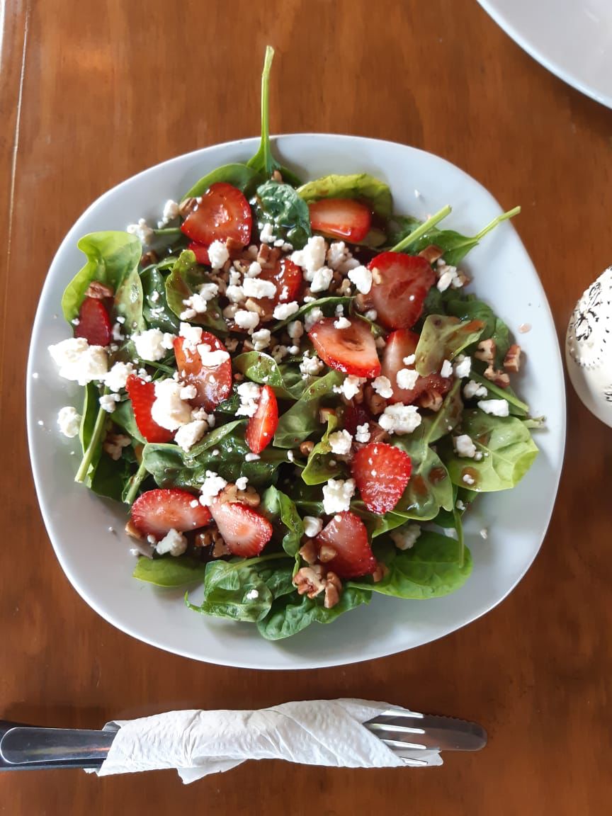 mezcla de espinacas fresca, rebanadas de fresa, nuez, queso feta y aderezo de frambuesa