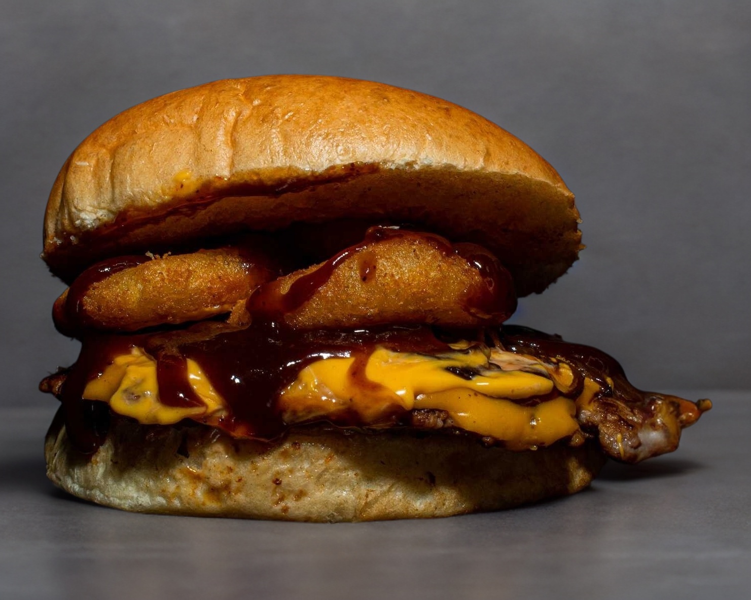 120 Gr. de jugosa carne de res, queso americano, aros de cebolla, BBQ y cebolla caramelizada.