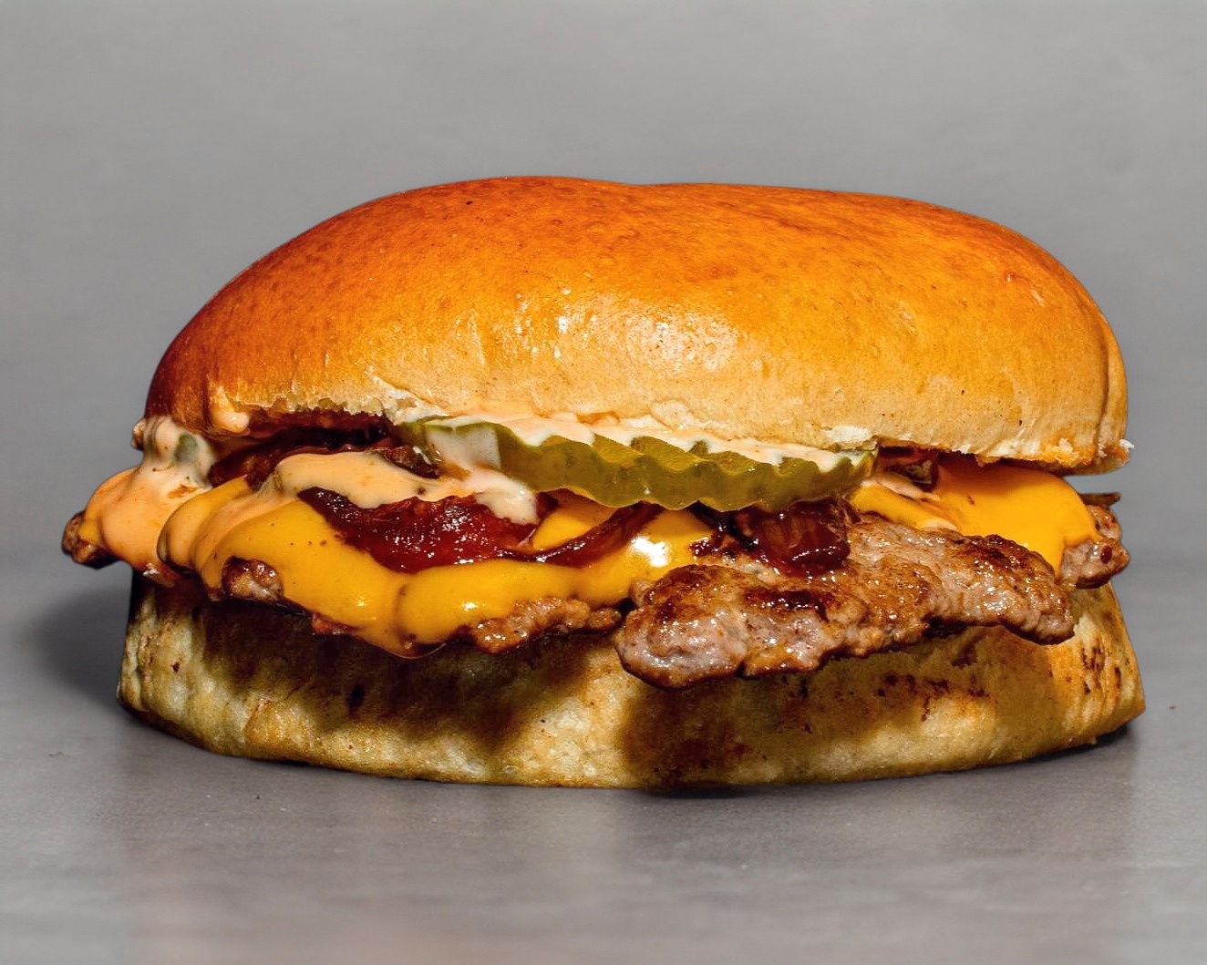 150 Gr. de jugosa carne de res, queso americano, queso cheddar, cebolla caramelizada y aderezo.