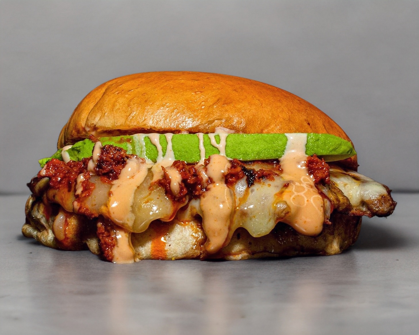 120 Gr. de jugosa carne de res, queso manchego, aguacate, chorizo, aderezo y cebolla asada.