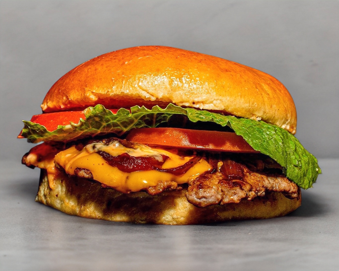 120 Gr. de jugosa carne de res, queso americano, jitomate, lechuga, aderezo y cebolla caramelizada.