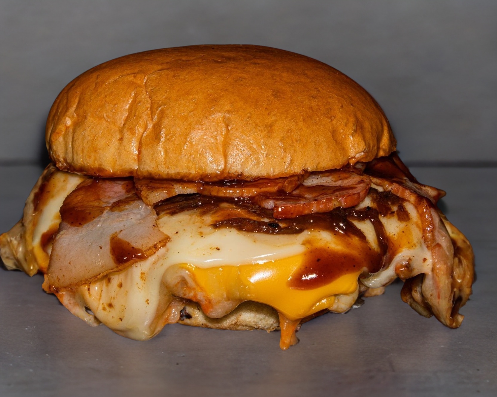 120 Gr. de jugosa carne de costilla de res, queso americano, queso cheddar, queso suizo, tocino, BBQ y cebolla caramelizada.