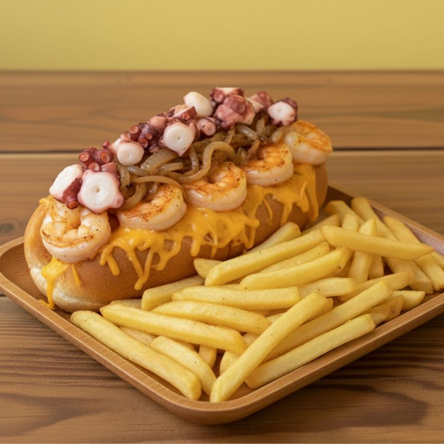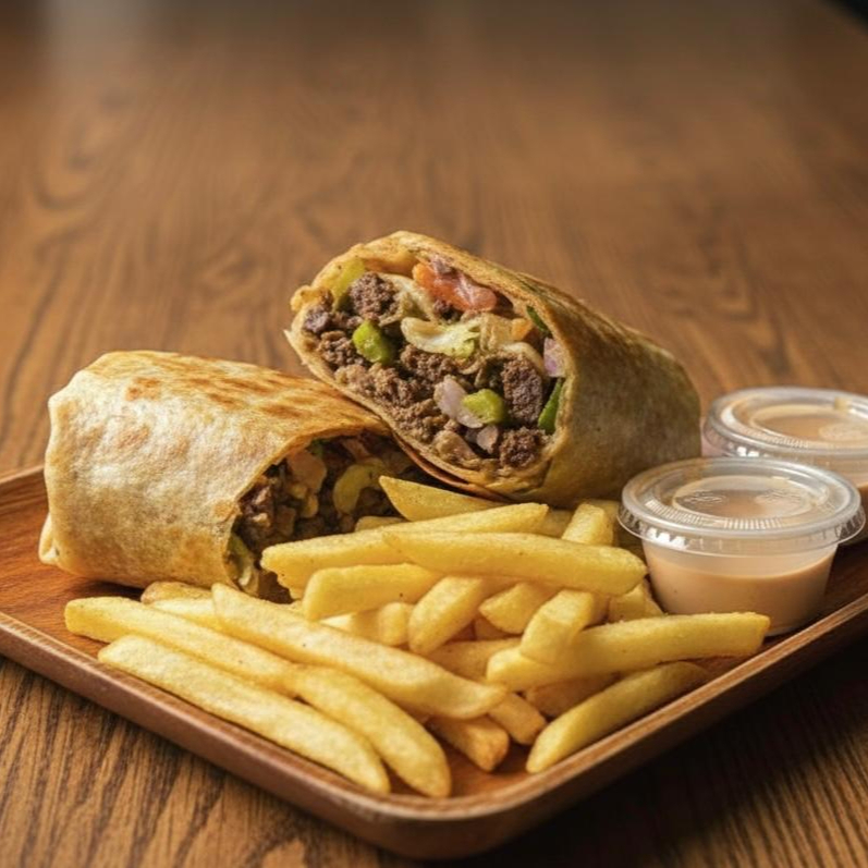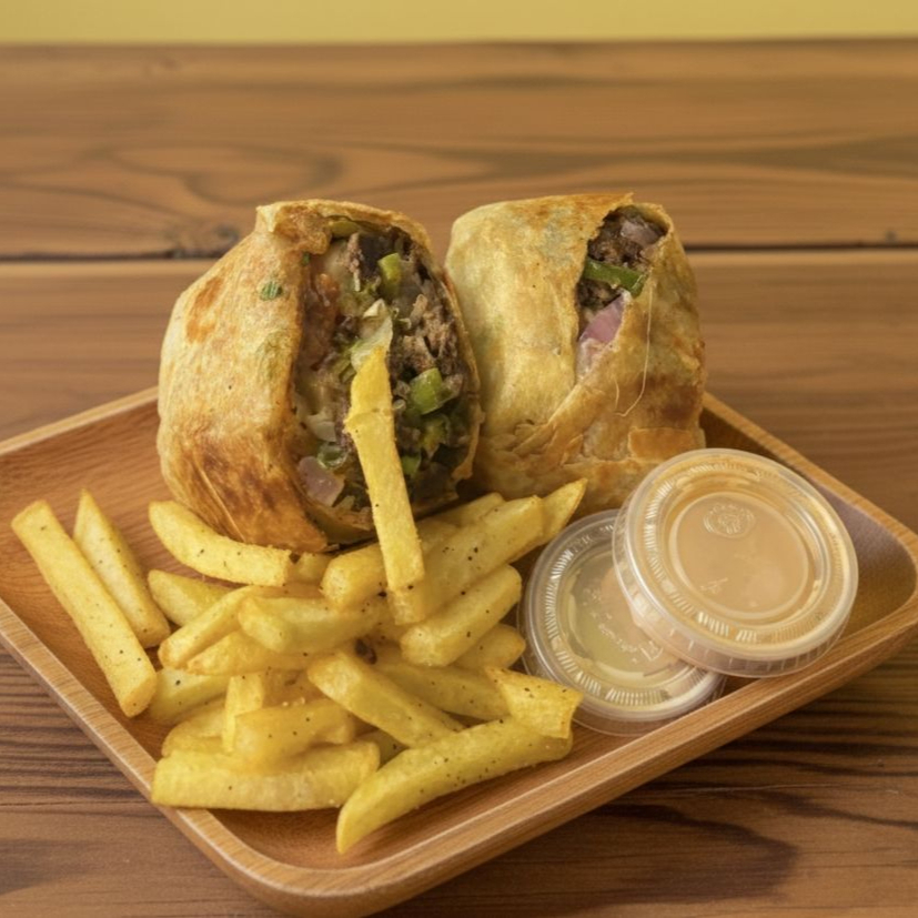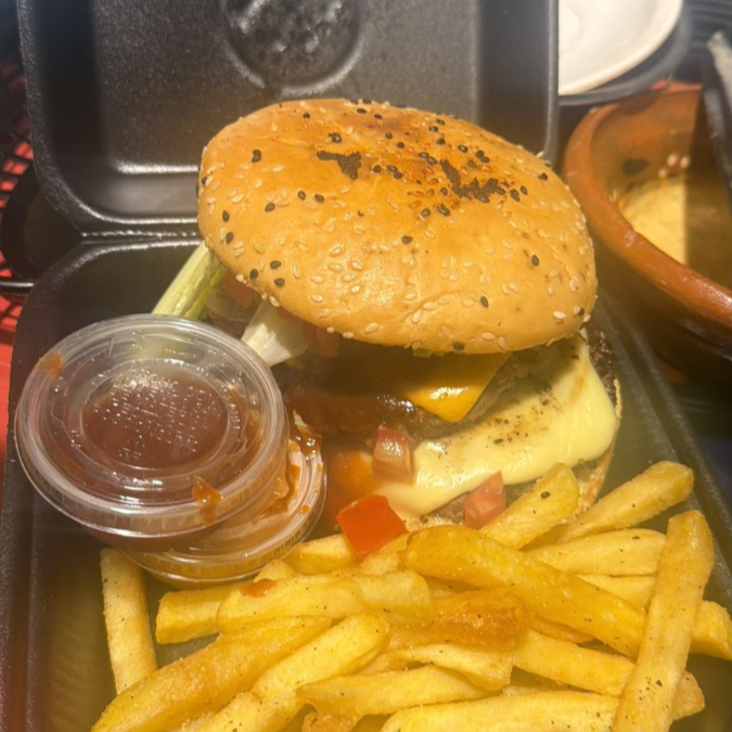Carne, queso, piña y cebolla caramelizada. acompañada de papas a la francesa y aderezo de chipotle y jalapeño.