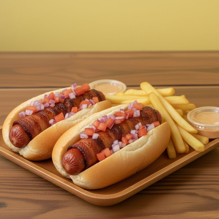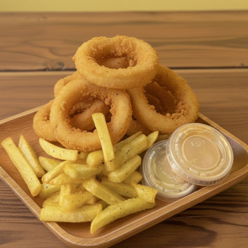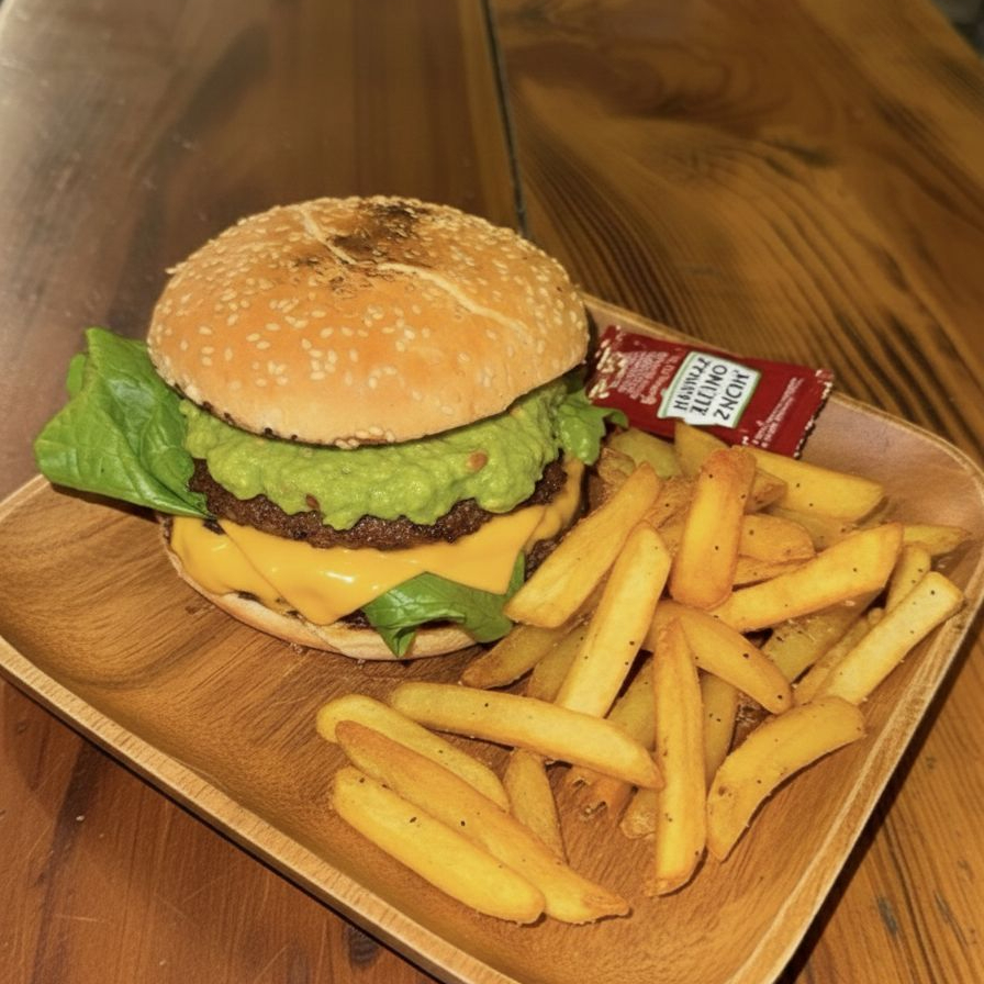 Doble carne, aros de cebolla con bbq, queso manchego, tocino, guacamole. acompañada de papas a la francesa y aderezo de chipotle y jalapeño