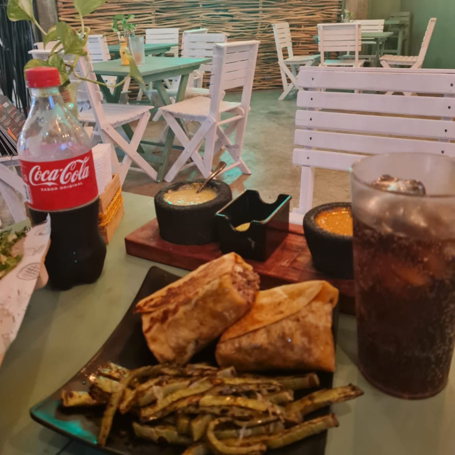 150 g De pollo, 50 g de chorizo, aguacate, lechuga, frijoles, queso manchego en t-harina. Incluye papas, ensalada y agua fresca.