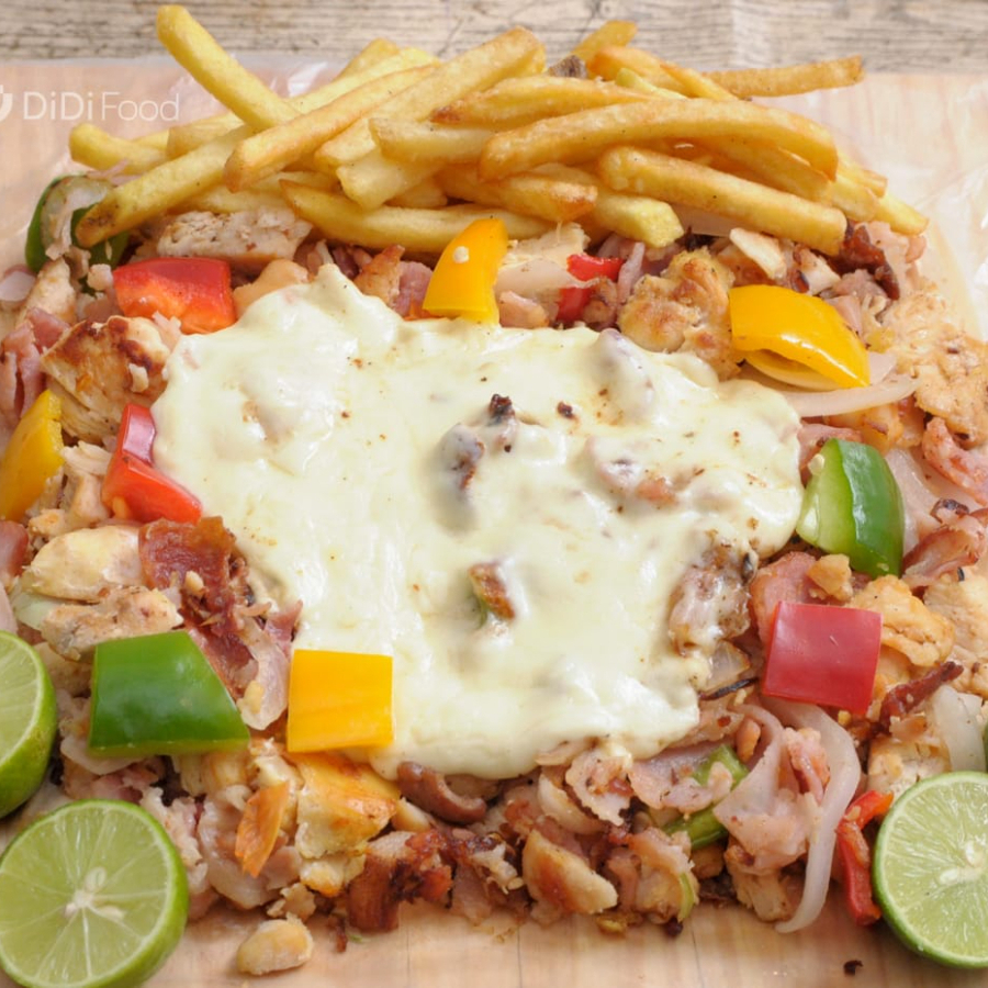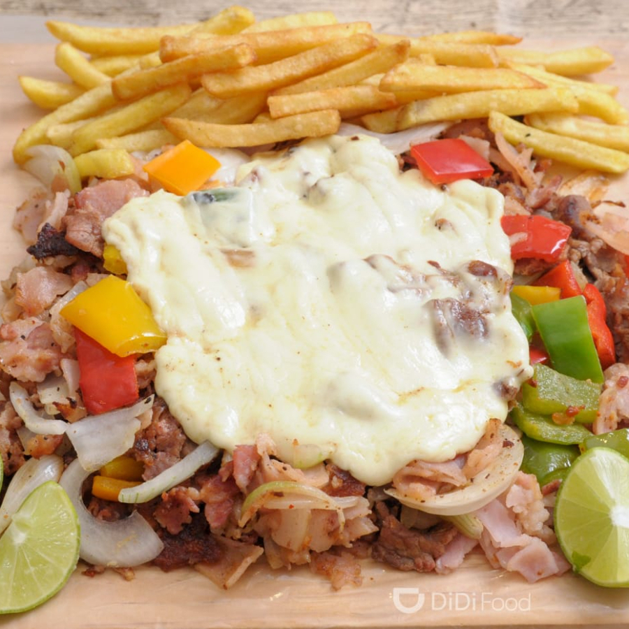 300 g De carne de pollo con pimiento, cebolla, tocino, queso oaxaca y papas a la francesa.