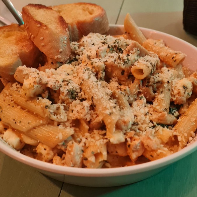 300 g De pasta penne, 130 g de camarón salteado al ajo bañado en salsa de chipotle, hojas de espinaca y queso philadelphia.
