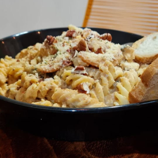 300 g De pasta fettuccini, 130 g de pollo, albahaca, queso panela, y nuez en salsa Alfredo.