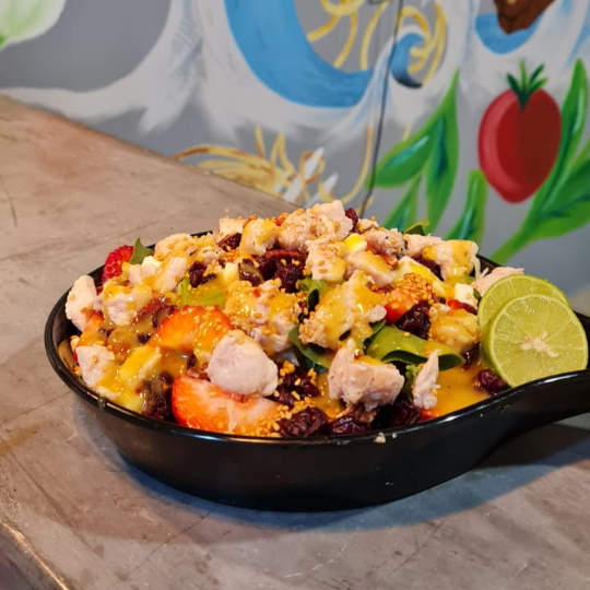 Espinaca baby, mix de lechuga, 150 g de pollo, láminas de fresa, queso panela, nuez caramelizada, manzana, lluvia de arándanos y un toque de aderezo mostaza con miel.