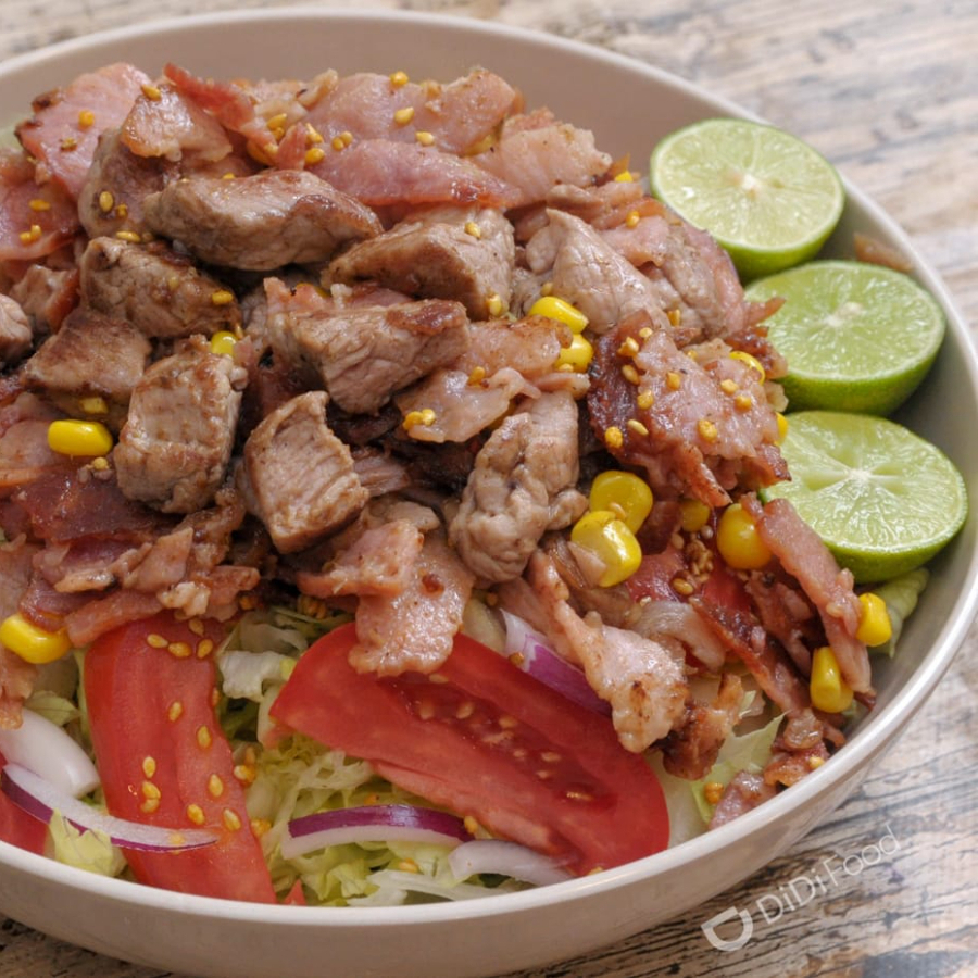 Lechuga orejona, 150 g de arrachera, 20 g de tocino, jitomate, granos de elote, cebolla morada, ajonjolí garapiñado y aderezo mil islas.