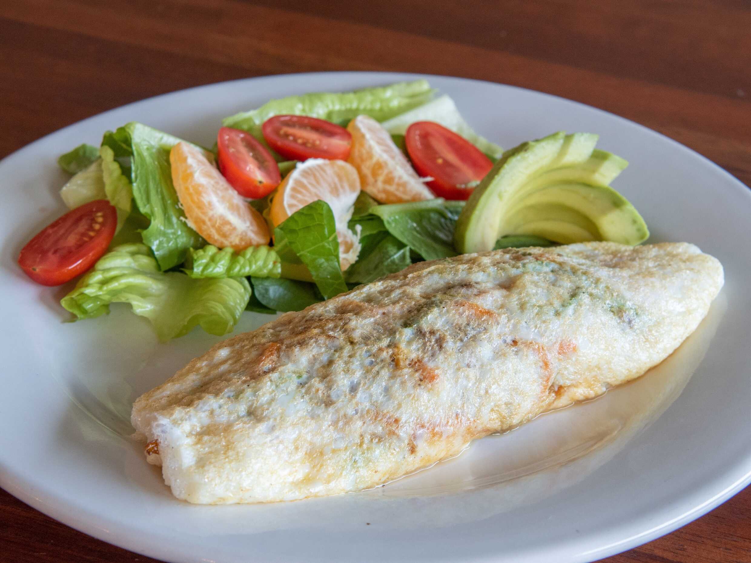 Claras de huevo, relleno con queso mozzarella y 2 vegetales a elegir, acompañado de ensalada y aguacate