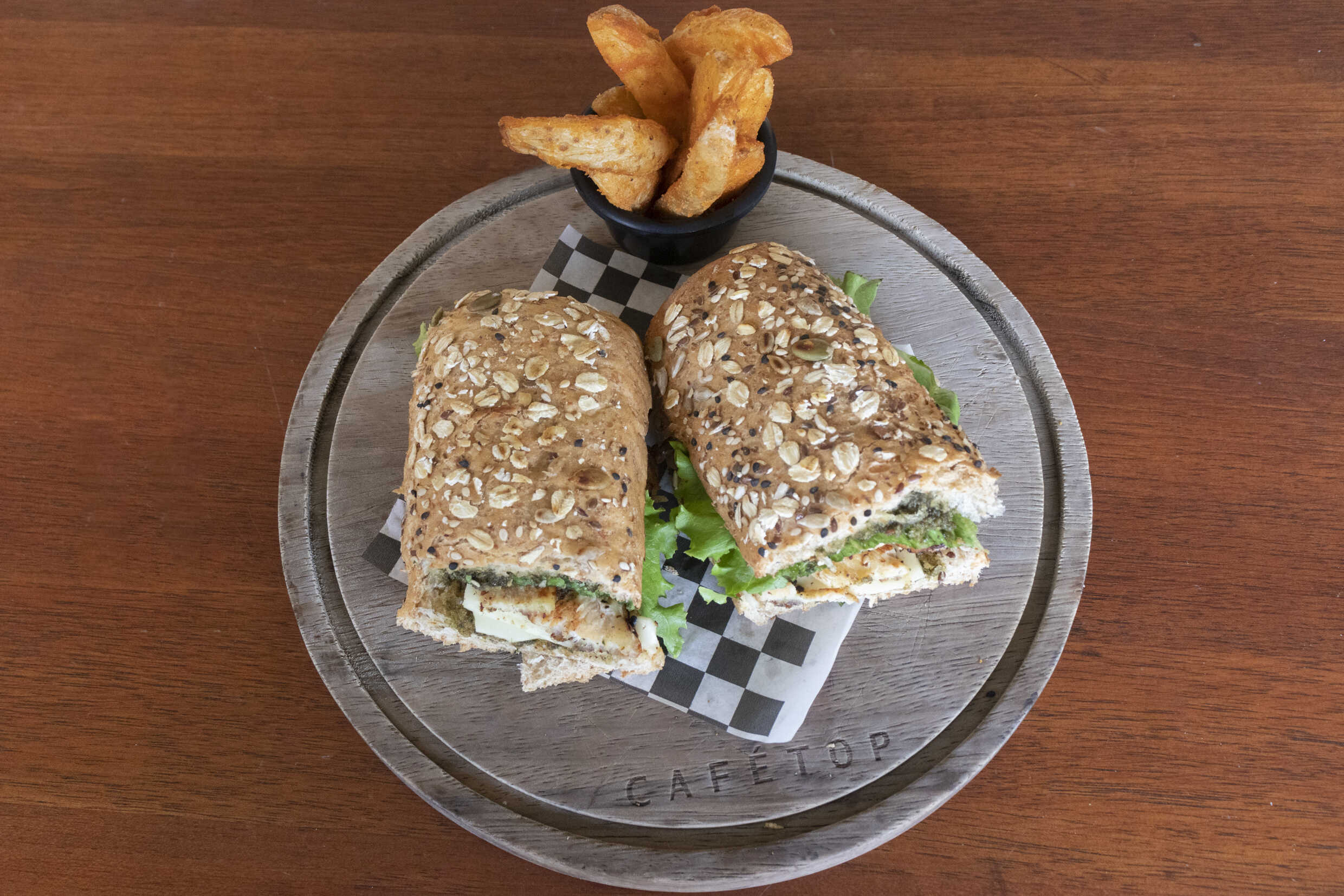 130 gr de pechuga de pollo a la plancha, queso suizo, pesto, espinacas.