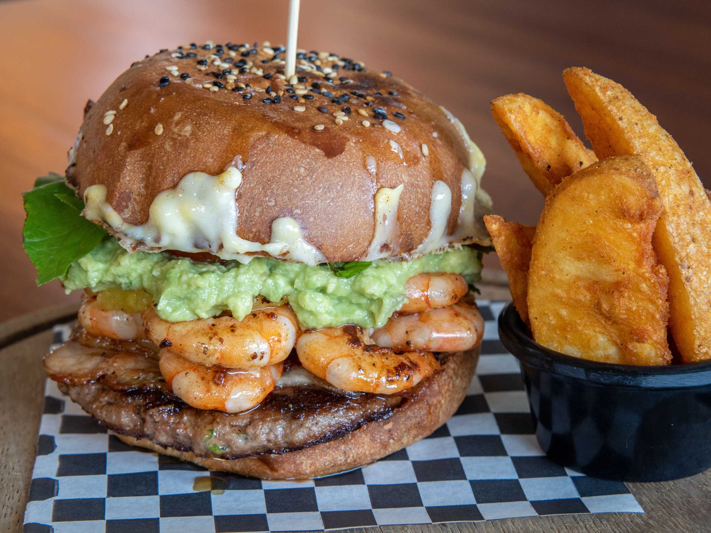 150 gr de carne de res, 130 gr de camarón, tocino, queso gouda, guacamole, jitomate, lechuga, Incluye papas fritas