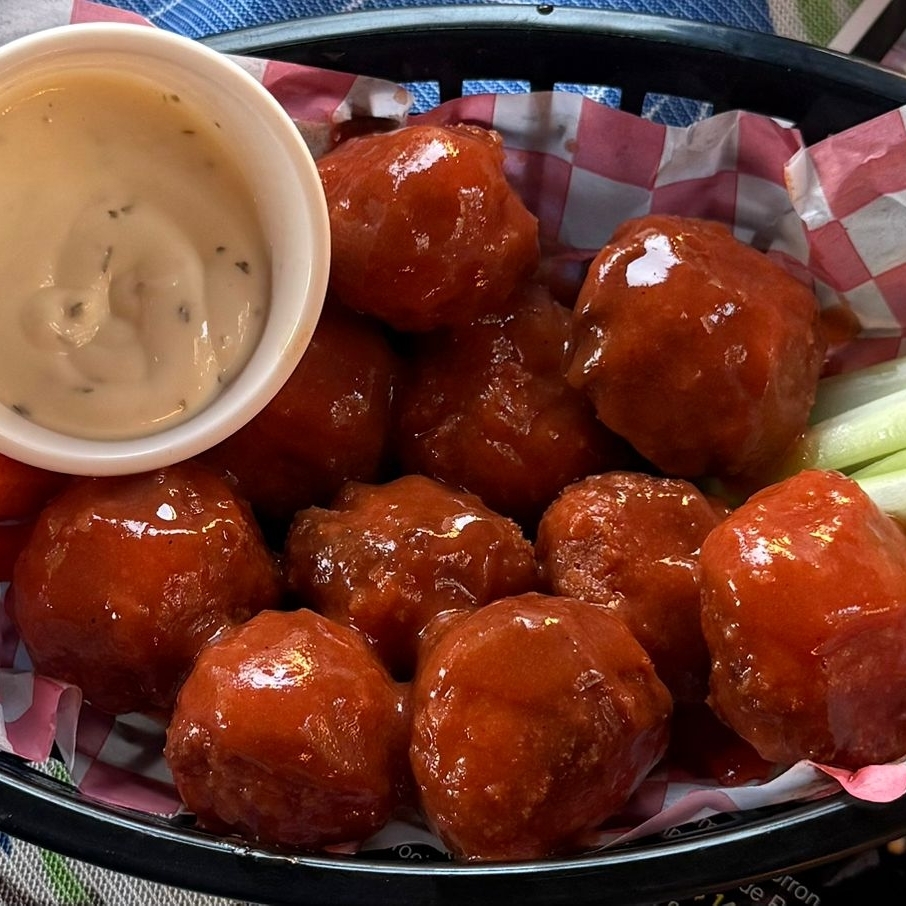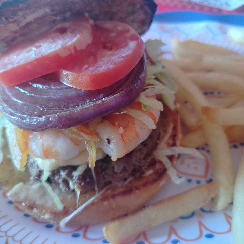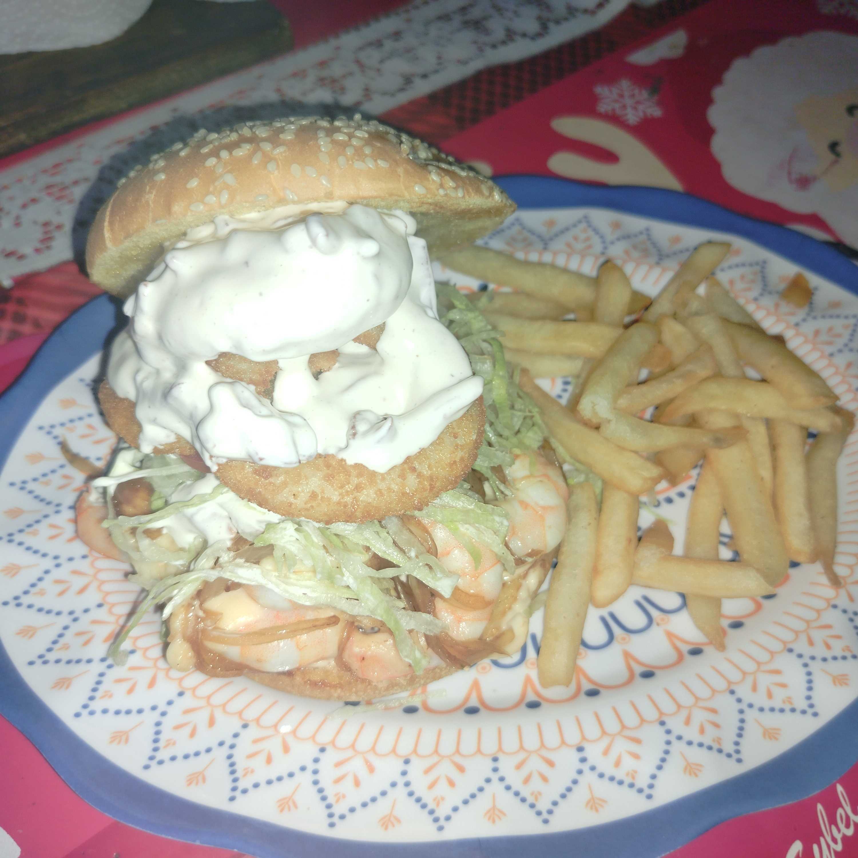 120 gr de Delicioso Camarón, Cebolla Guisada, Queso Gouda, Aros de Cebolla, Con un Rico Aderezo Tartara Con Tocino y Papas Fritas