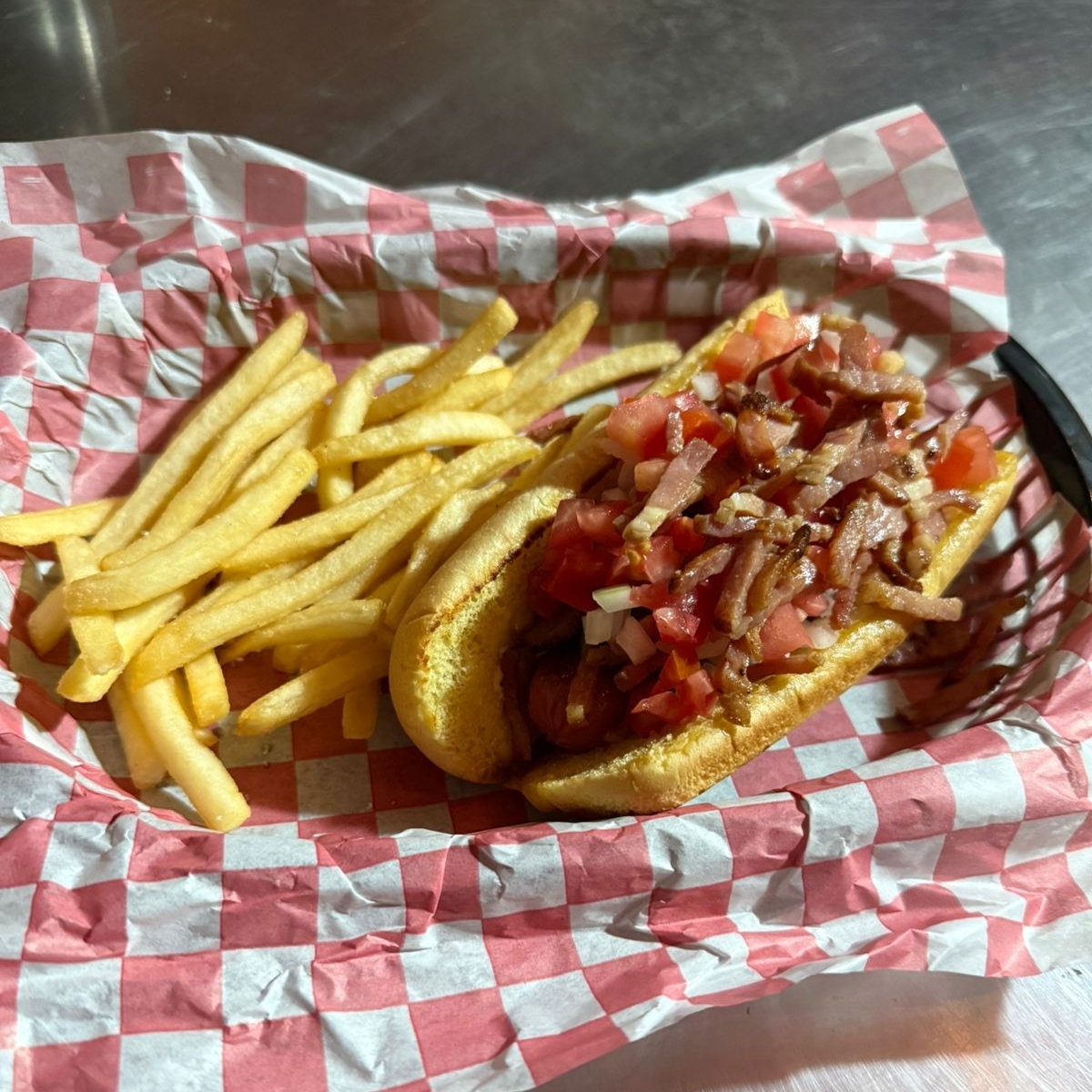 Salchicha, tocino y papas Fritas